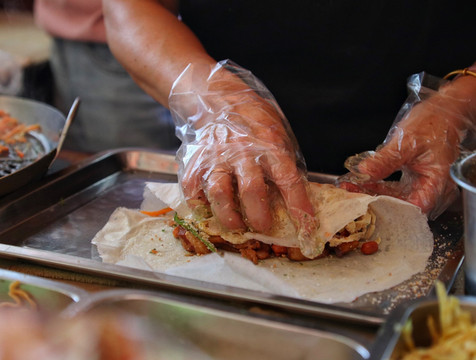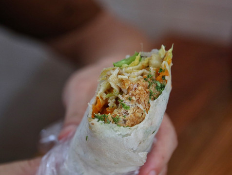 阿菇润饼菜, 厦门 叫薄饼, 泉州 则称为润饼,这家阿菇润饼菜不一样的地方是包进去了一整根的麻粩,麻粩也是一种闽 南特 产,脆脆的,香香的,然后在麻粩之上堆上润饼菜,最后卷起来,全部都是在店门口的小屋现做。已经吃了两家店的我们,惊呆了。不过一吃起来就停不下口了。