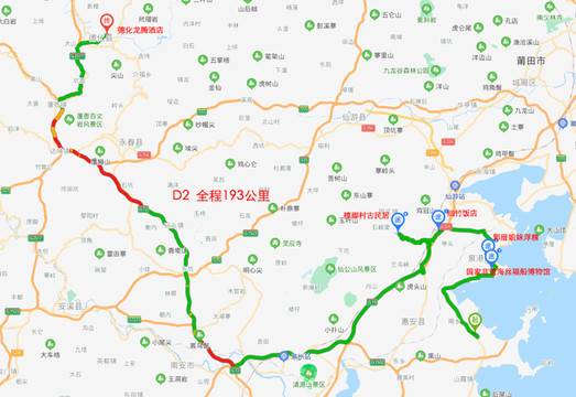 德化 县是 泉州 最北部的地区,与 三明 的 大田 、 尤溪 接壤。不这次行程不能离开 泉州 境,因此从 莆田 仙游 上高 速就不可行了,走沈海高速回 泉州 环城高速接泉南高速,里程数和时间差不多,路况也较好,约1小时50分钟。
