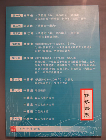 之后林女士的祖父林质彬接过衣钵,被称为“ 福建 首位陶瓷彩画艺人”,代表作《雪景》被 福建 省博物馆永久收藏,《寒雪初下》更是被编入了 景德镇 陶瓷学院教材。其父亲、叔伯都是 德化 有名的陶瓷名家。现在林晓芳个人工作室“肃雅堂”还展有清末至今林氏一门的作品以及珍贵手稿。
