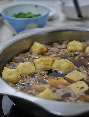 可能是老天被我们这些吃货感动,一路上又是大风又是大雨的,还有那蜿蜒曲折的国道,好不容易到了蓬壶镇,蓬壶老牌肉羹汤说是七点就已经打烊了,好在镇子到处都是咯摊,找了家人多的但是很简陋的咯摊打打牙祭。不过锅底上来后,王老师,也就是 永春 女婿却连连摇头,这一锅清水飘着豆腐泡,在他看来似乎不太正宗,一行人吃起来自然也没有味道。