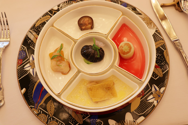 前菜的出场颇具仪式感,圆形的托盘,带来家庭团圆和事事圆满的美意,精工打造的小菜很雅致,阿胶猪手手指柠檬,酸甜交织,有阿胶的滋补与猪手的鲜美,更有手指柠檬的清新,独特的味觉体验;水果甜椒西施舌,清新爽口;桂花冰淇淋蜜薯,甜蜜软糯,创新而美味;中间的头水紫菜包,鲜美滑嫩,入口就是福建海洋的气息;龙岩酒香河田鸡,带来山城醇厚香浓,让人回味无穷。