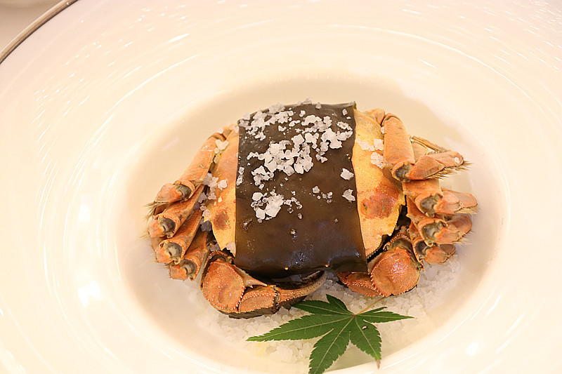 昆布盐煎大闽蟹:秋季正是蟹黄膏满的时候,昆布的清新为蟹肉的醇厚增添了别样的风味,煎制的手法更是让蟹肉的香气四溢,鲜咸交织,令人回味无穷。