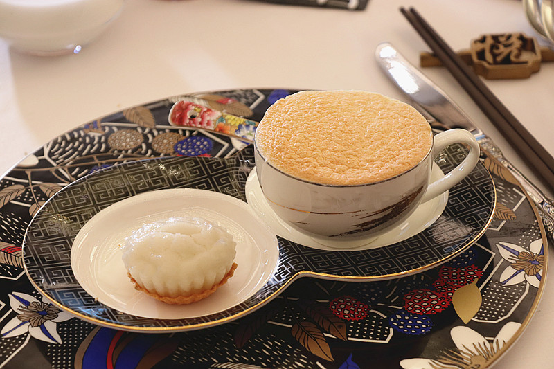 喜气开场、甜味结束,福建宴会的甜品是压轴的,芋泥花生汤普通的菜名,但是在悦宴,这道菜的的出场还是很惊艳,蛋白形成的泡面覆盖其上,有点西式咖啡或者奶茶的味道,而碗里的芋泥软糯香甜,花生细腻软滑,汤汁浓稠,味感清甜,搭配的 福建碗糕鳕鱼脆片酥脆可口。