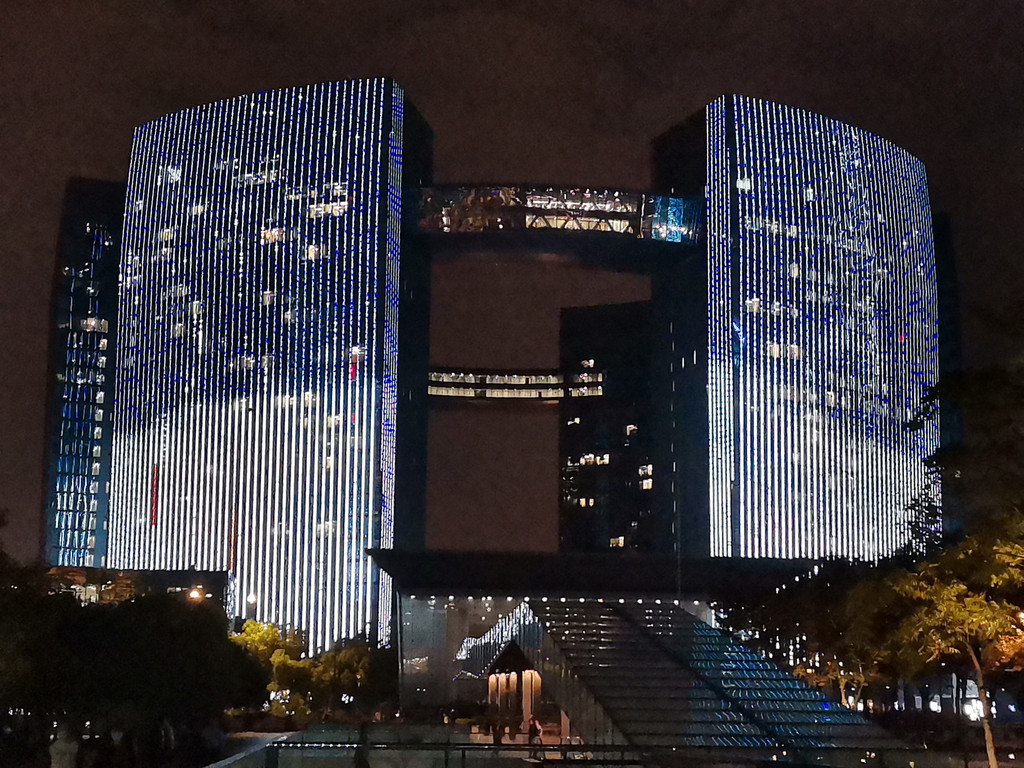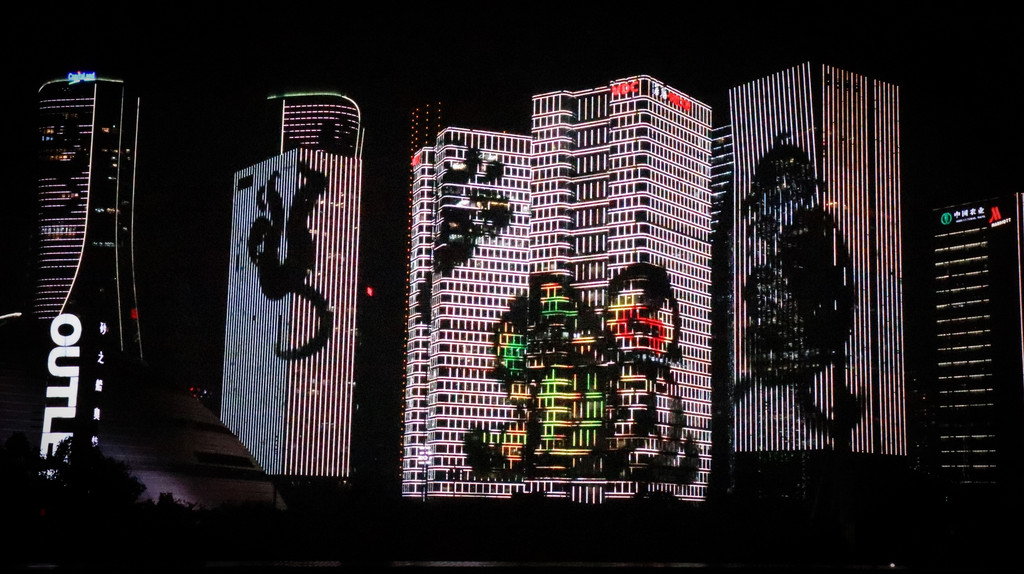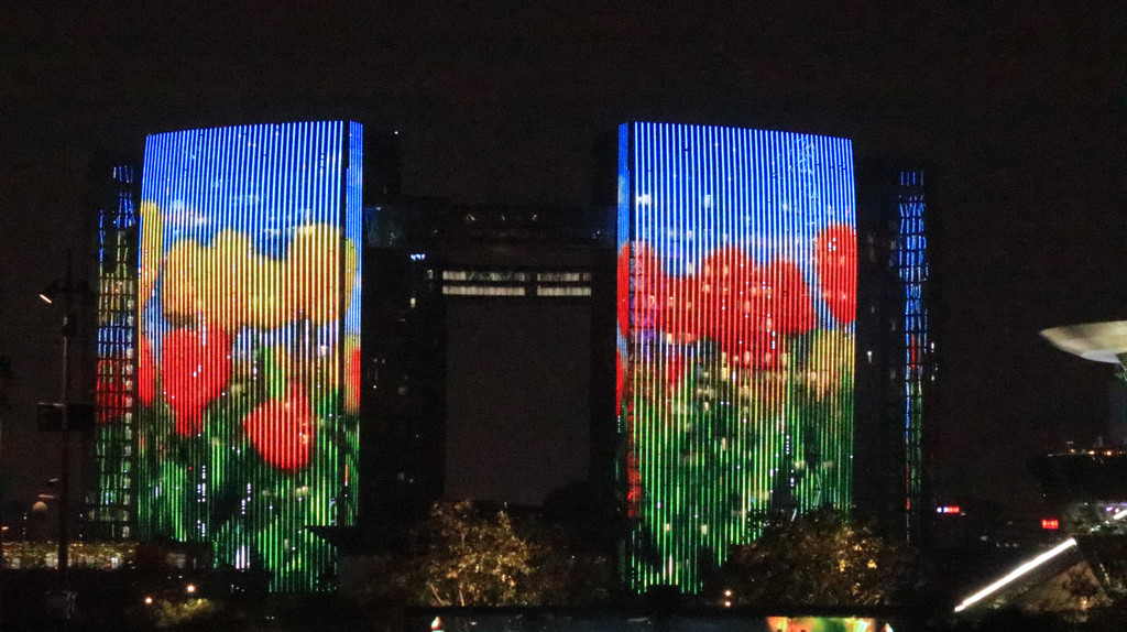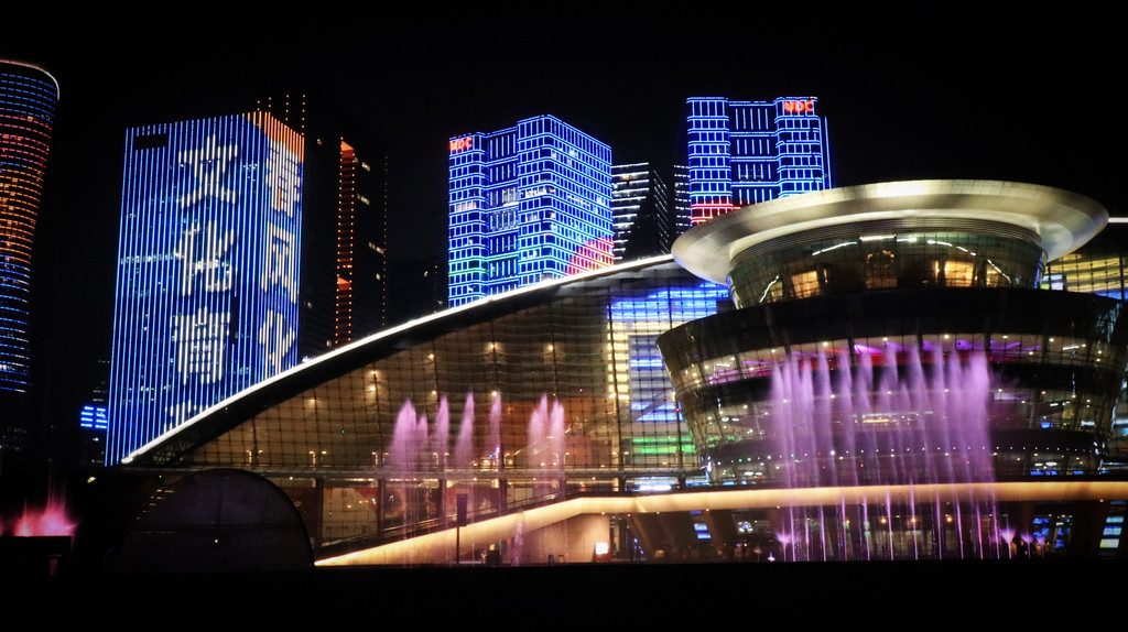 杭州从湖向江发展,在钱塘江边建起新城,每周2,5,6晚上都有二场20分钟的灯光秀(19:30,20:30),乘#4地铁在市民中心站下,经过一个很大的OUTLITS,上电梯即是观景地方 --“-城市阳