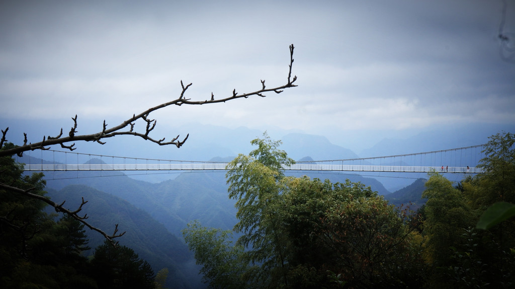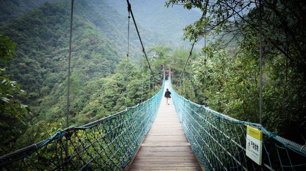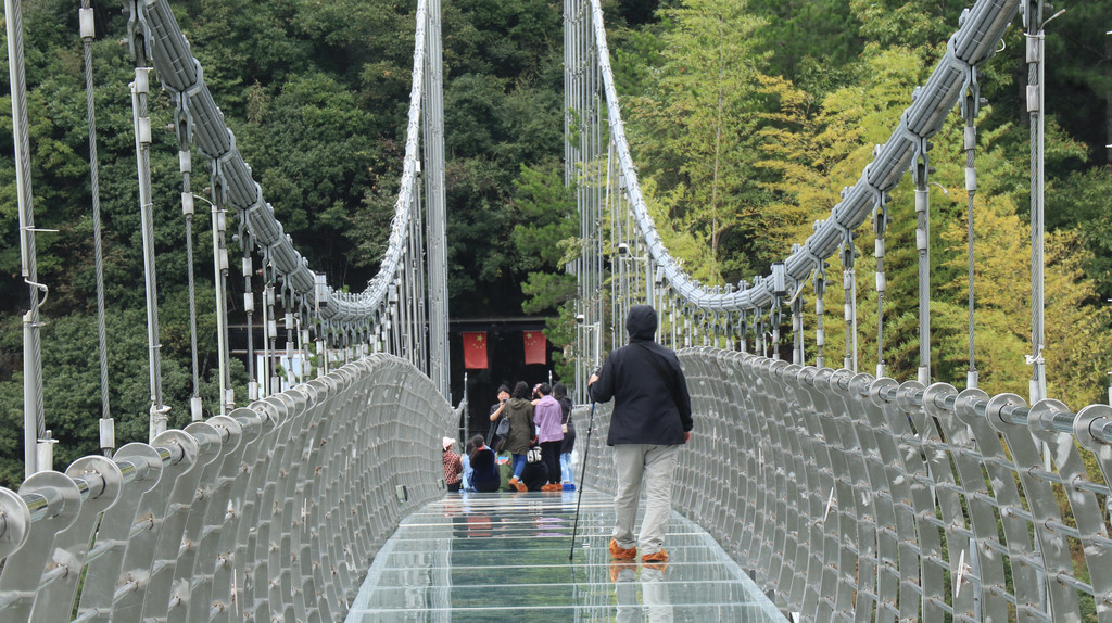 桥上风不小,鞋套既保护玻璃,也可防滑。悬桥悠悠晃晃为山谷幽岚增色