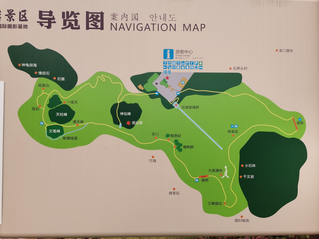 >60老人:上桥费+优惠半价门票,每人要125元。游客中心入门,下山台阶走向玻璃悬桥---