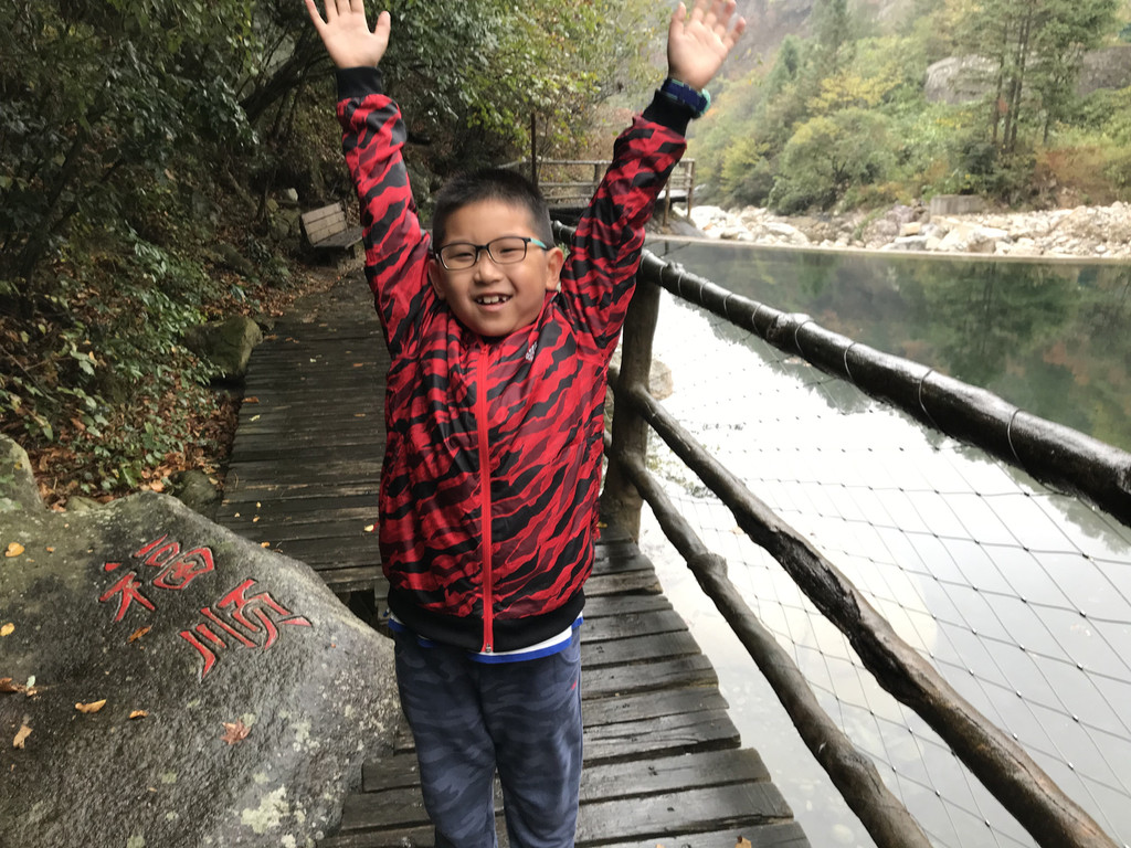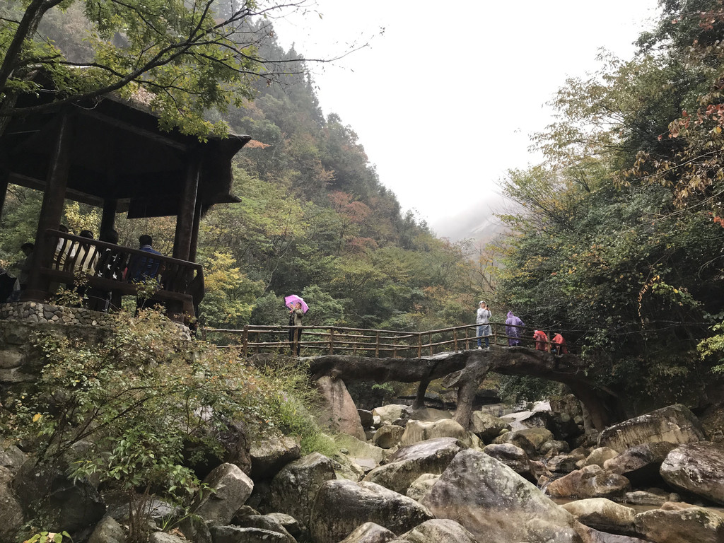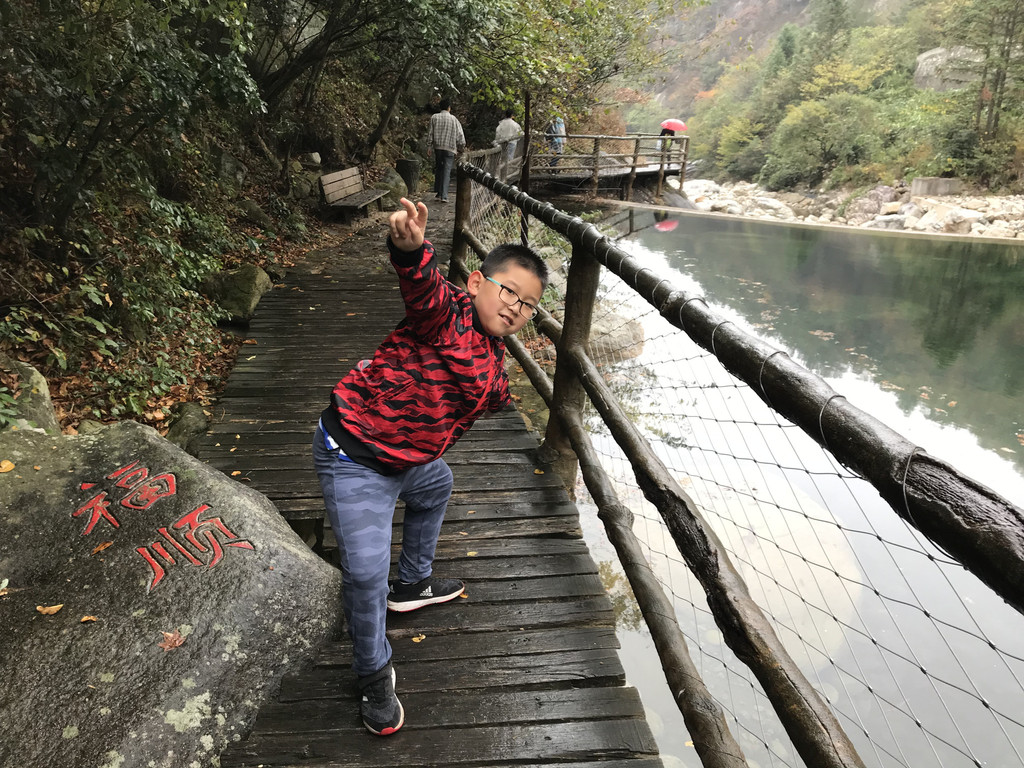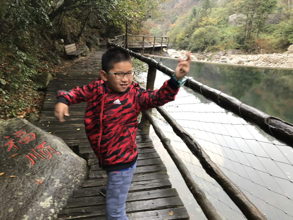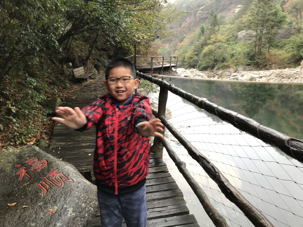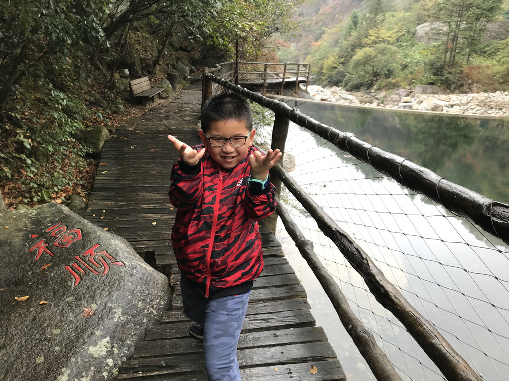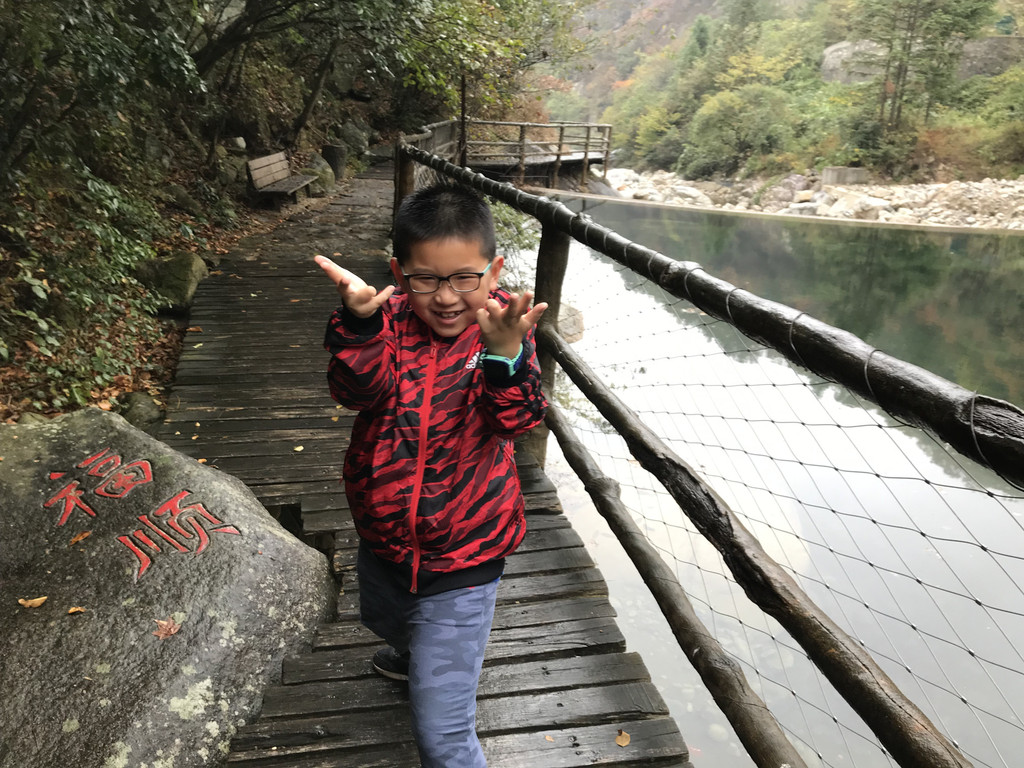 8:10AM,我们走入大峡谷栈道入口,开始游玩。今天细雨绵绵,气温骤降12度,峡谷里凉飕飕的,但景色很不错。我们一路前行,山林寻芳,峡谷探幽,溪边摸鱼,比赛掷石子,一路赏景观花玩不够。走累了,就俯身溪旁,掬一捧山泉清流,润湿脸颊,提神醒脑,感受山泉水的清凉洁净,享受大自然的山林野趣。