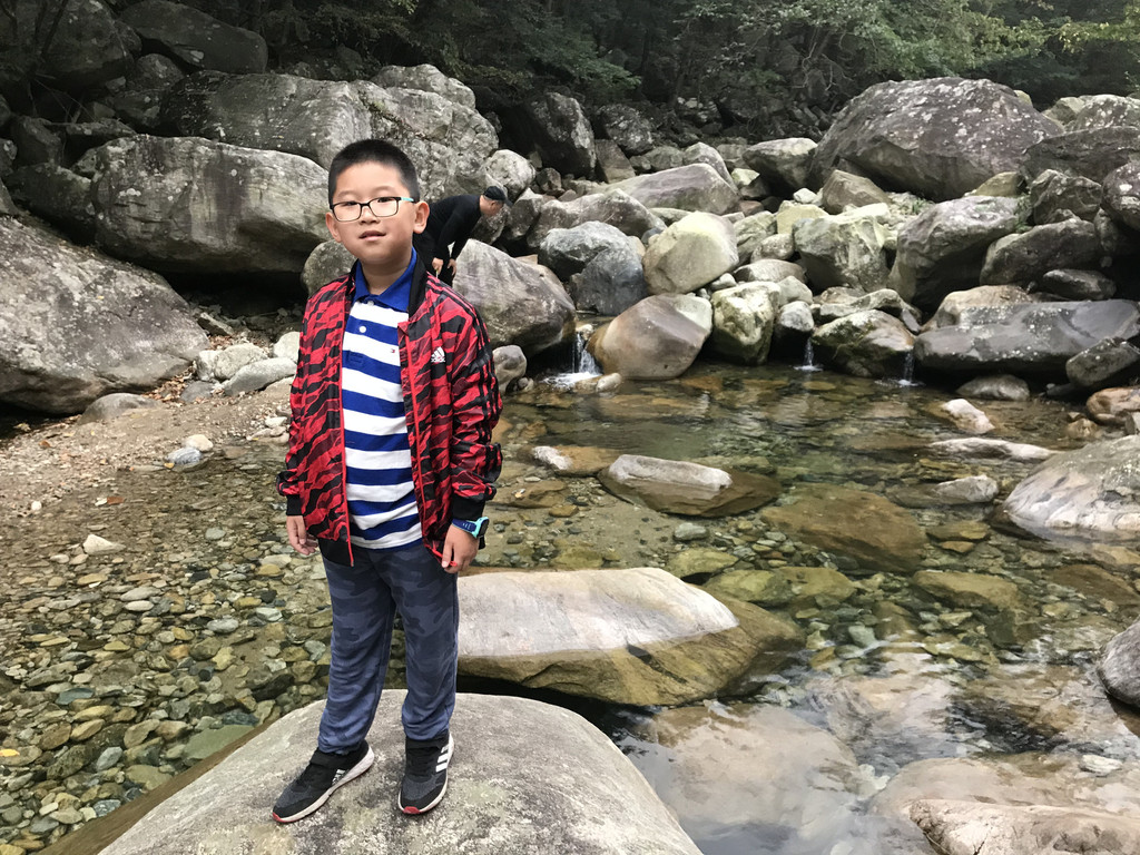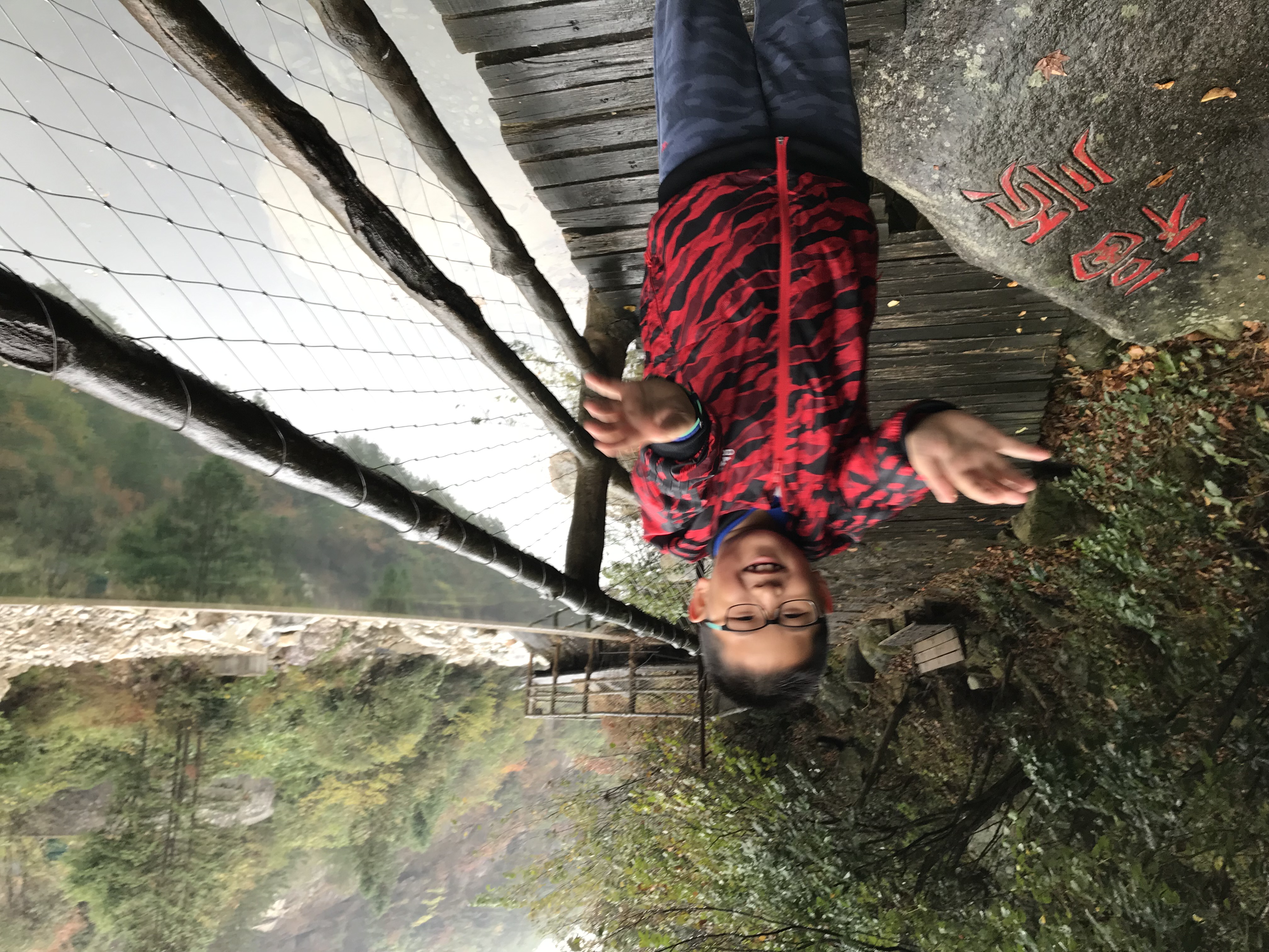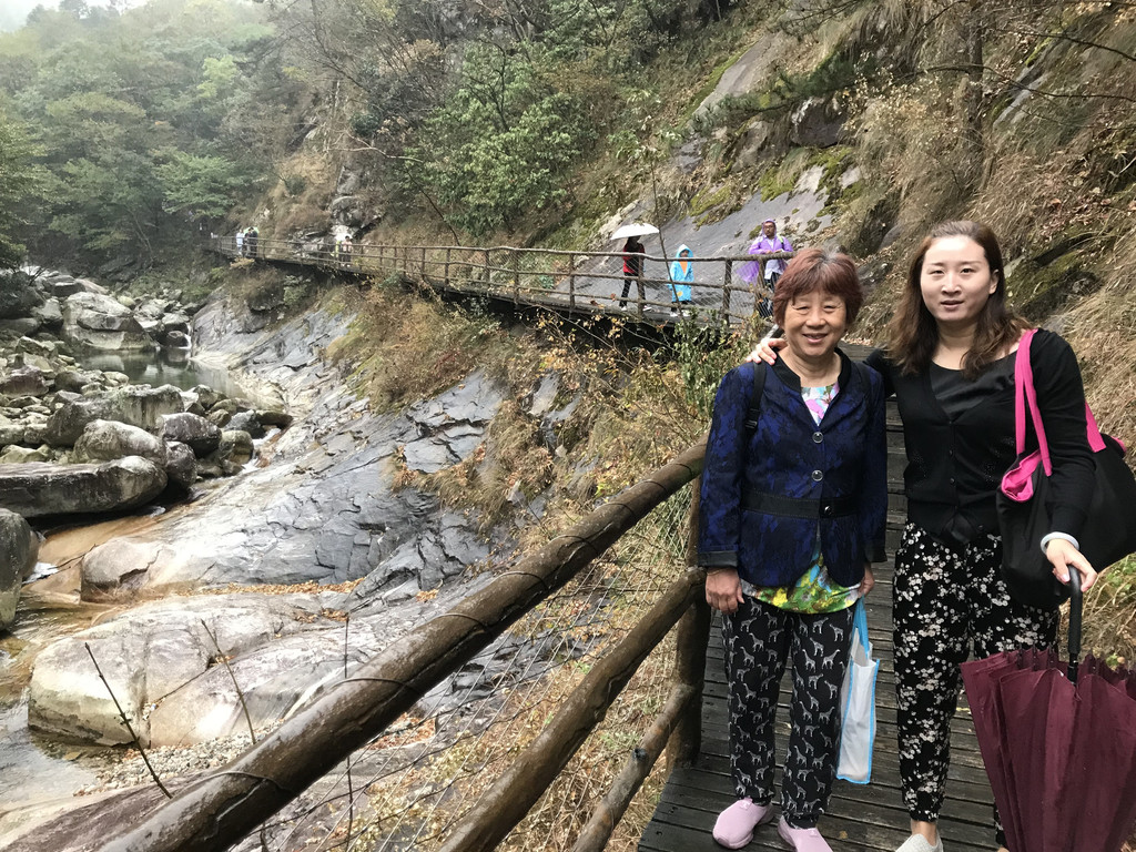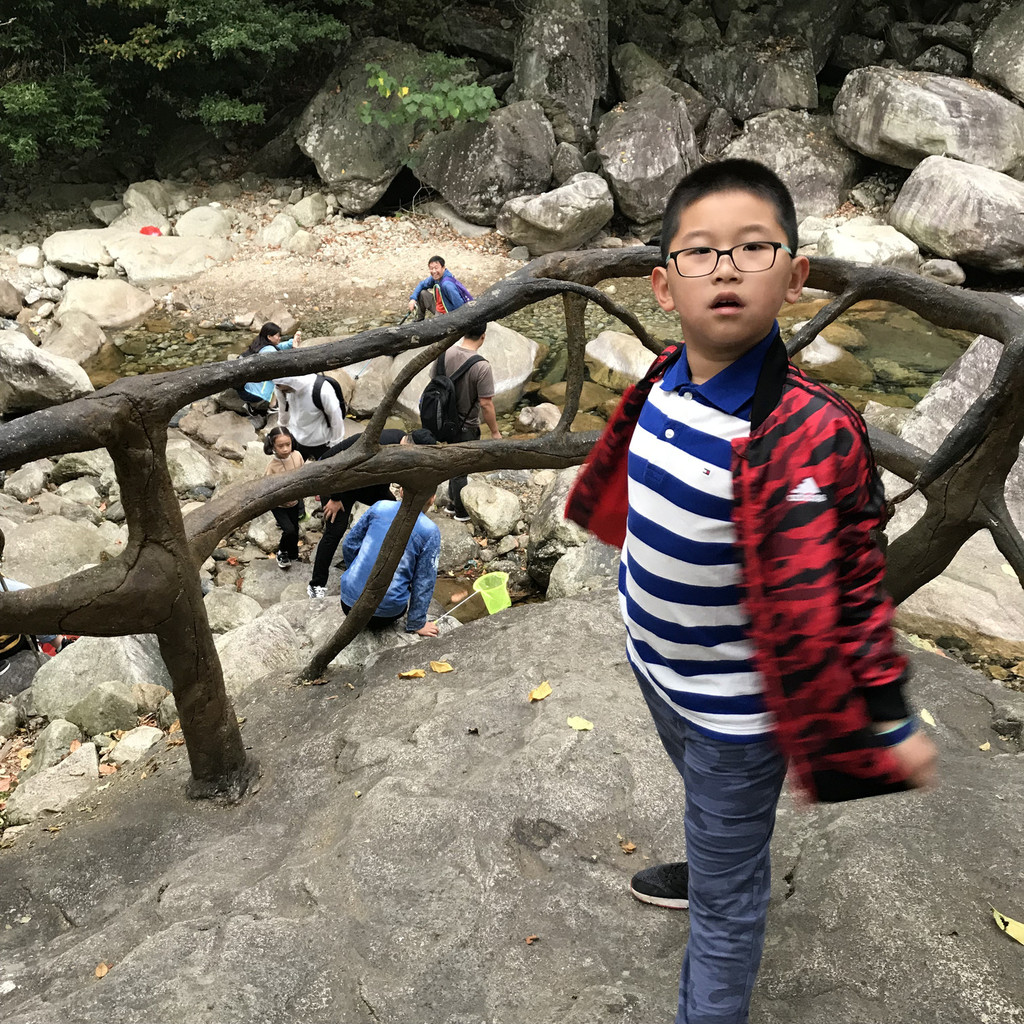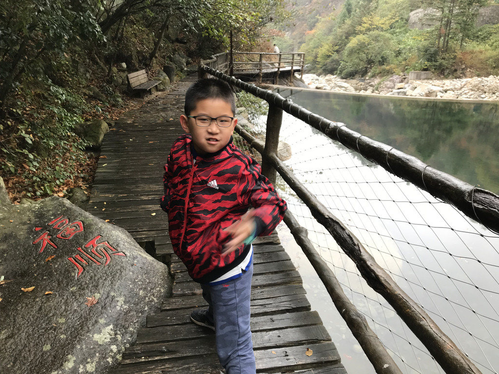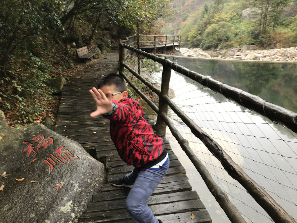8:10AM,我们走入大峡谷栈道入口,开始游玩。今天细雨绵绵,气温骤降12度,峡谷里凉飕飕的,但景色很不错。我们一路前行,山林寻芳,峡谷探幽,溪边摸鱼,比赛掷石子,一路赏景观花玩不够。走累了,就俯身溪旁,掬一捧山泉清流,润湿脸颊,提神醒脑,感受山泉水的清凉洁净,享受大自然的山林野趣。
