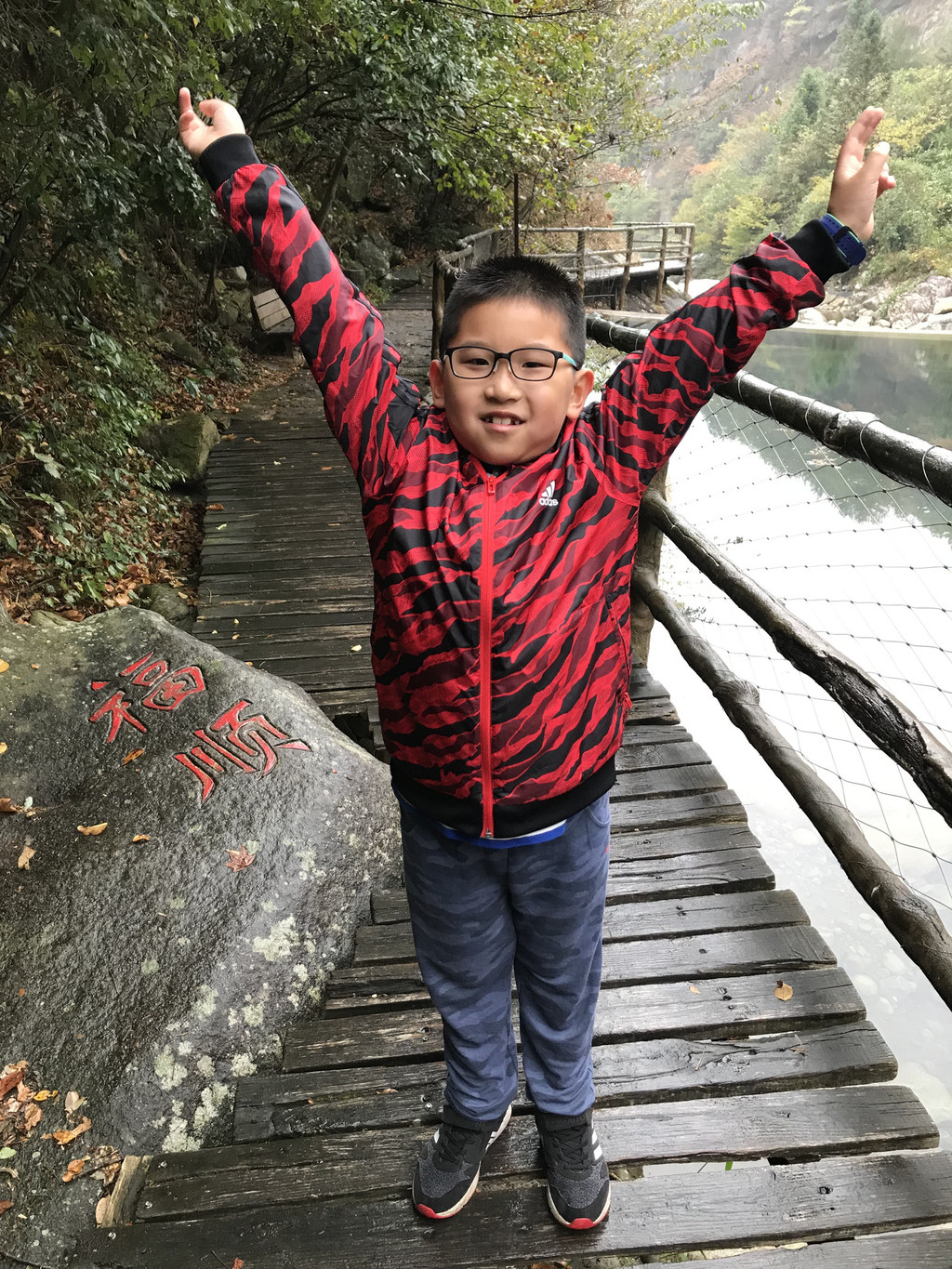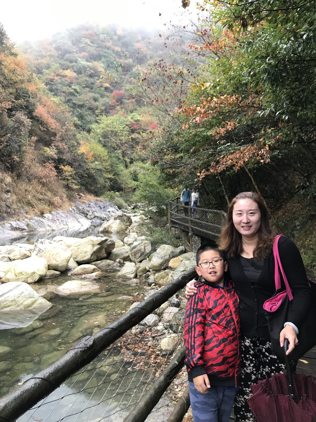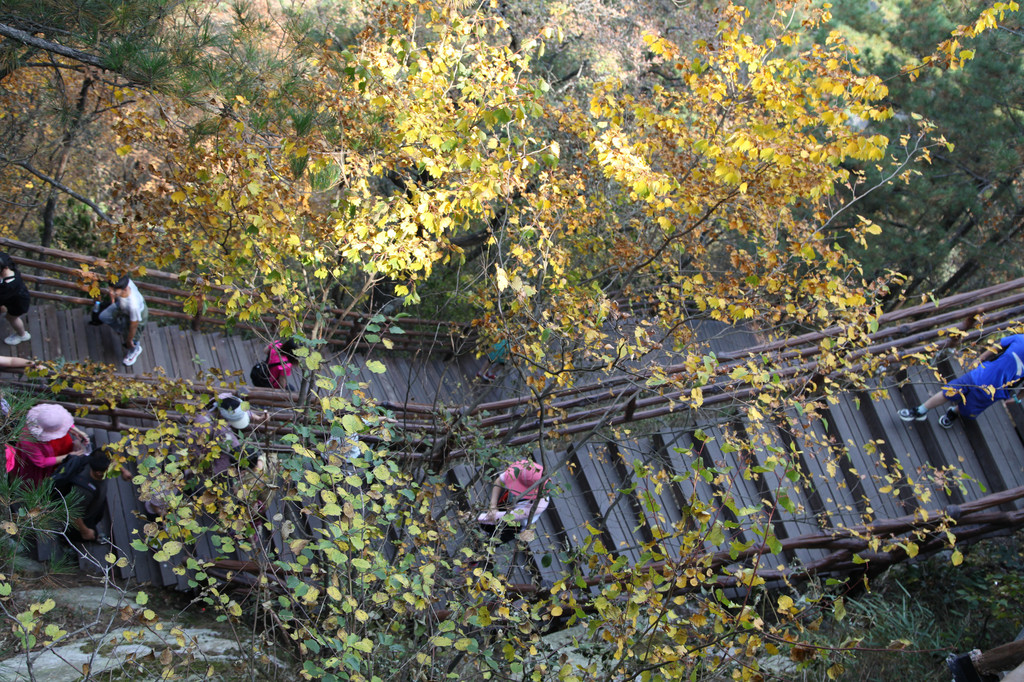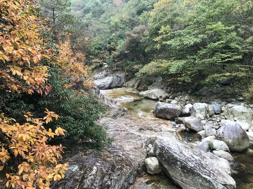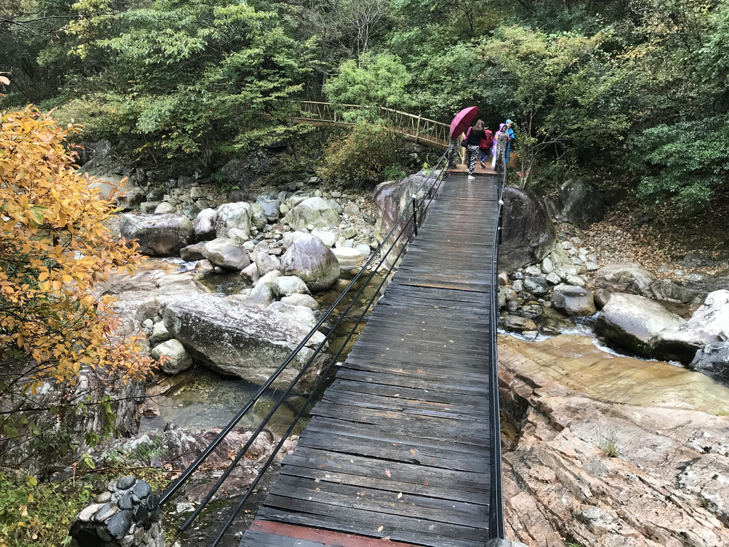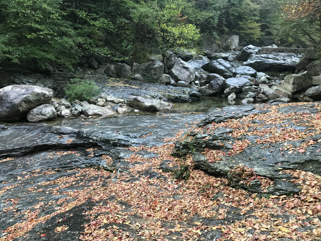 8:10AM,我们走入大峡谷栈道入口,开始游玩。今天细雨绵绵,气温骤降12度,峡谷里凉飕飕的,但景色很不错。我们一路前行,山林寻芳,峡谷探幽,溪边摸鱼,比赛掷石子,一路赏景观花玩不够。走累了,就俯身溪旁,掬一捧山泉清流,润湿脸颊,提神醒脑,感受山泉水的清凉洁净,享受大自然的山林野趣。
