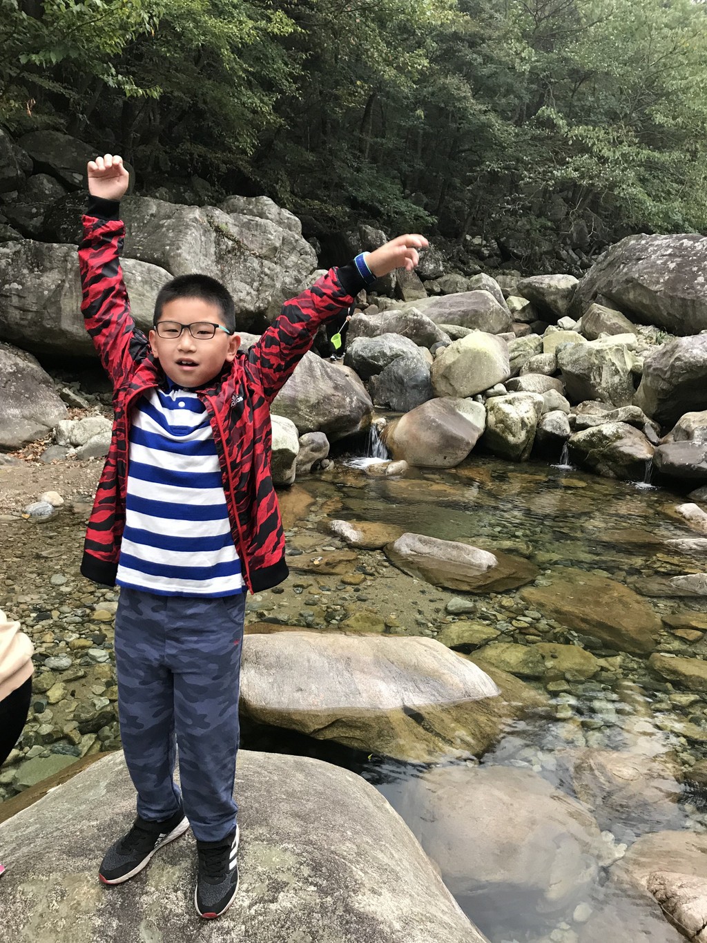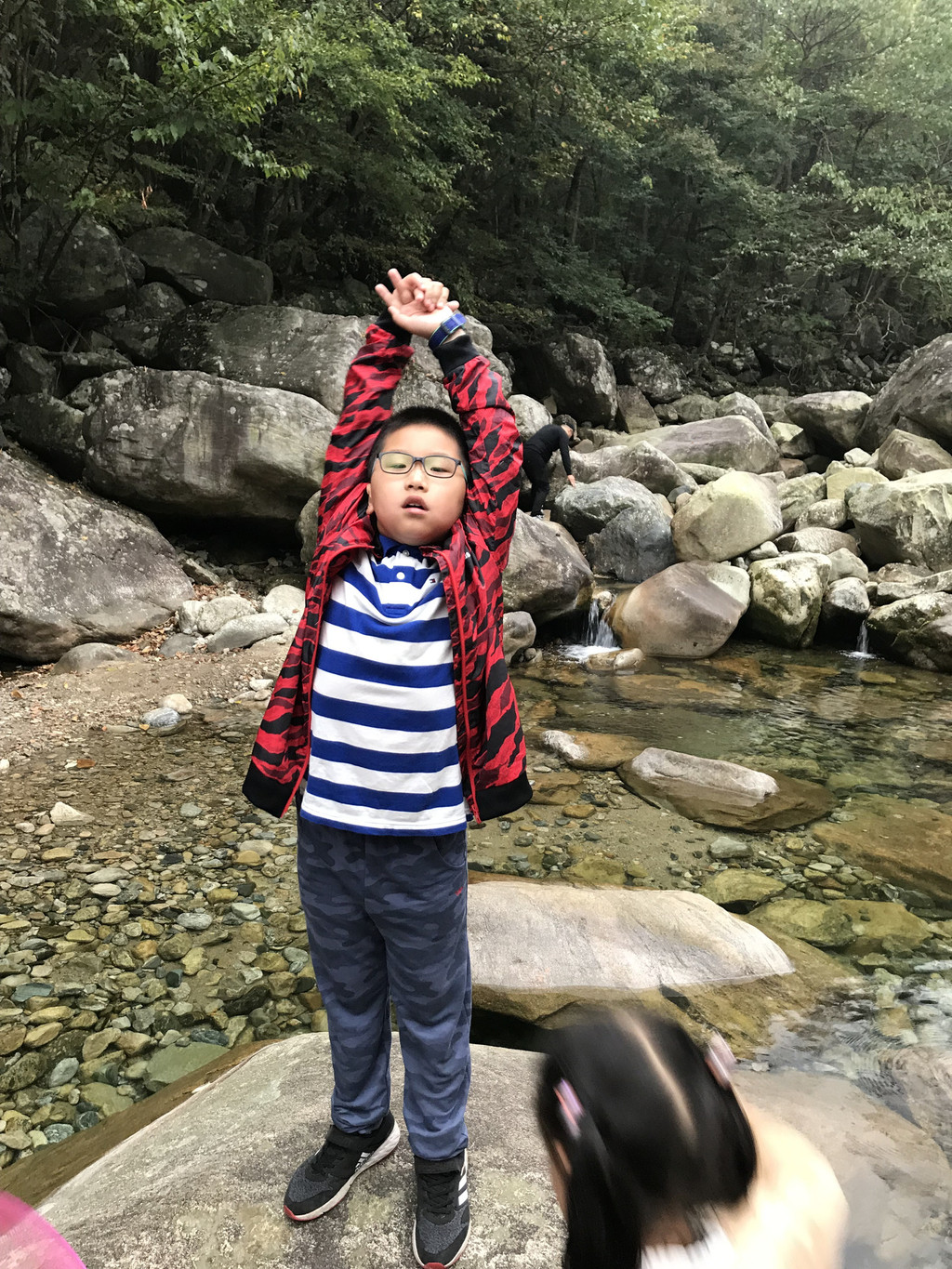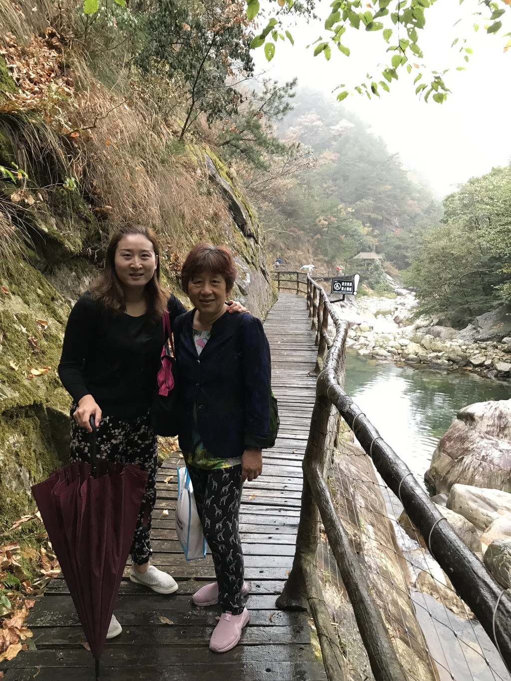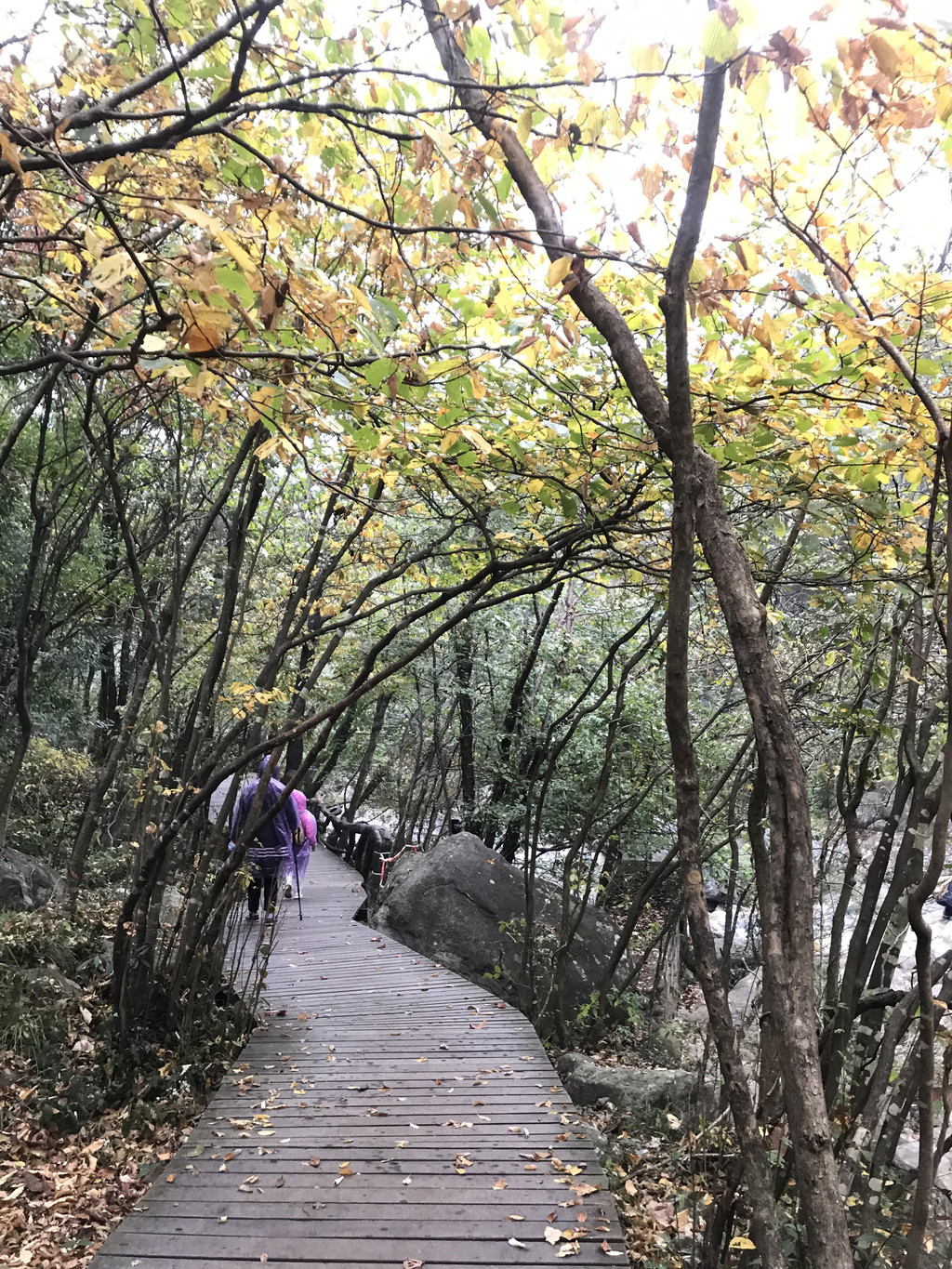 8:10AM,我们走入大峡谷栈道入口,开始游玩。今天细雨绵绵,气温骤降12度,峡谷里凉飕飕的,但景色很不错。我们一路前行,山林寻芳,峡谷探幽,溪边摸鱼,比赛掷石子,一路赏景观花玩不够。走累了,就俯身溪旁,掬一捧山泉清流,润湿脸颊,提神醒脑,感受山泉水的清凉洁净,享受大自然的山林野趣。