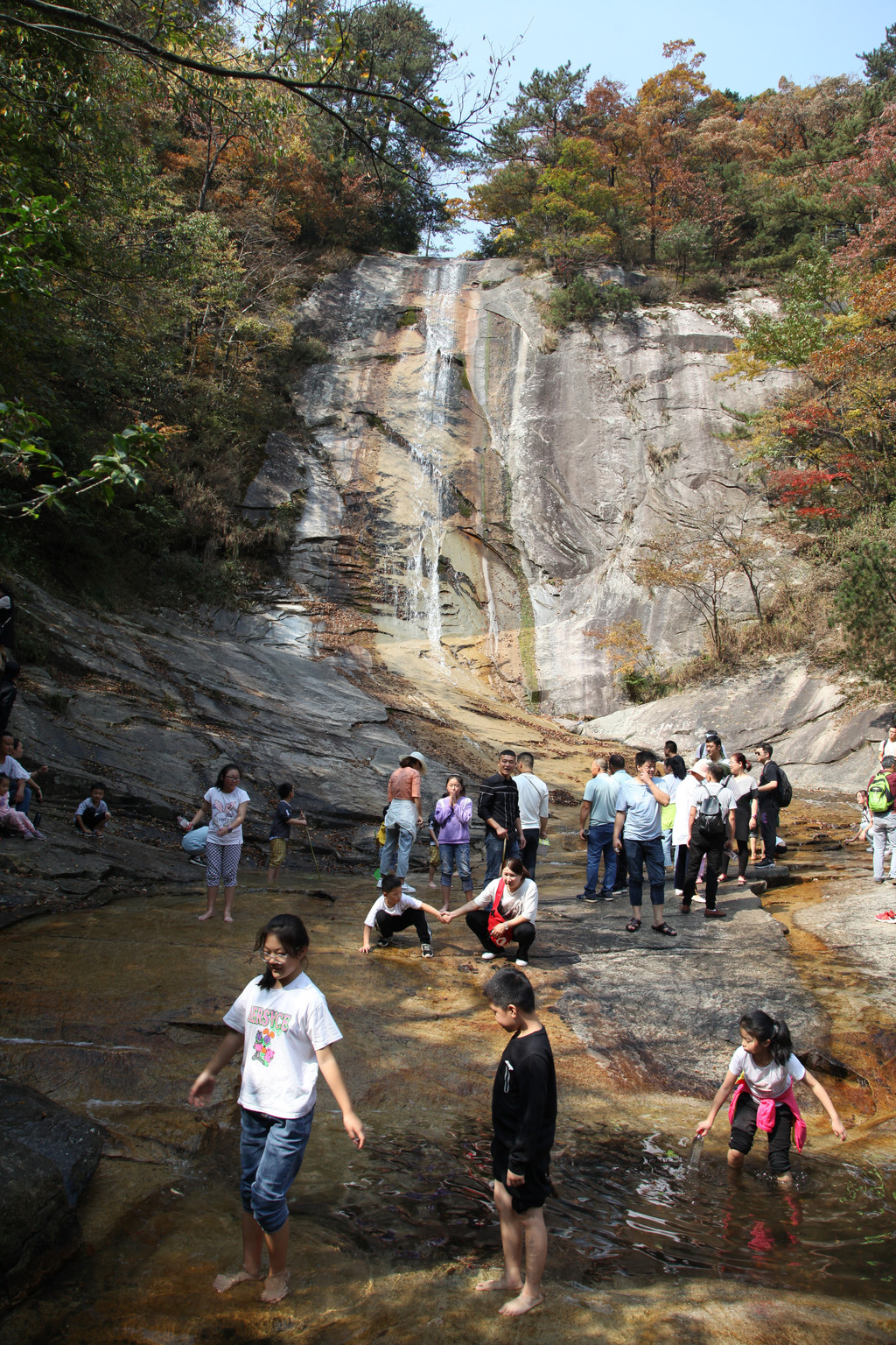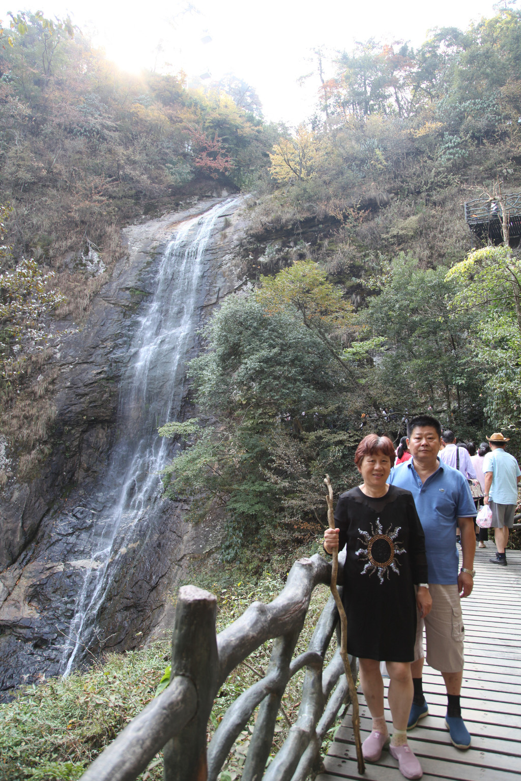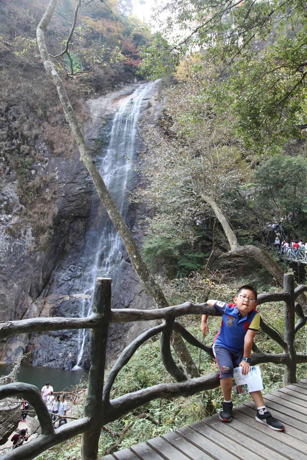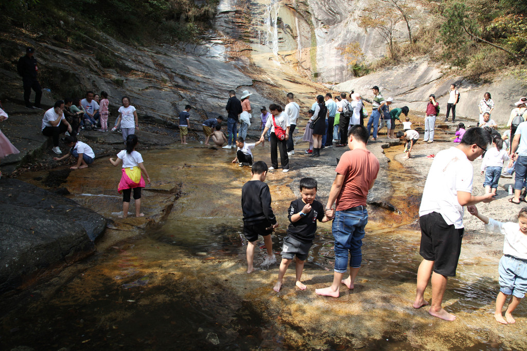 我们乘坐景区巴士,直接坐到终点站虎行地。下车后,沿着栈道徒步上山,第一个看到的是落差71米、水帘幅宽8米的九影瀑,只见一道银练,高挂崖前,飞冲而下,溅起层层水雾,在阳光的照耀下现出彩虹。崖底是一个深潭,潭面30平方米。尚在远处,就能听到泉水叮咚,翠玉作响。
