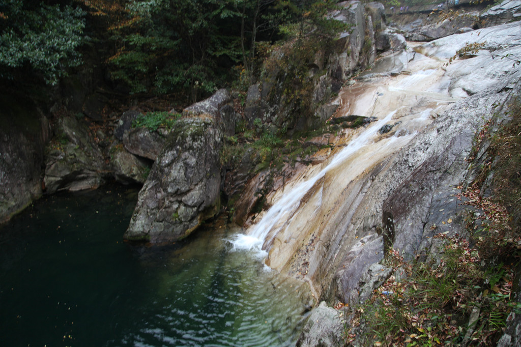 继续向上爬,经过情人瀑、剑劈石,来到泄玉瀑,泄玉瀑布垂直高度62米,水帘宽11—13米。站在潭边,抬头仰望,只见水瀑似落花飞雪,珠落玉盘,奔流而下。瀑岩呈淡紫色,岩面凹凸,潭如翠玉,清亮温润。