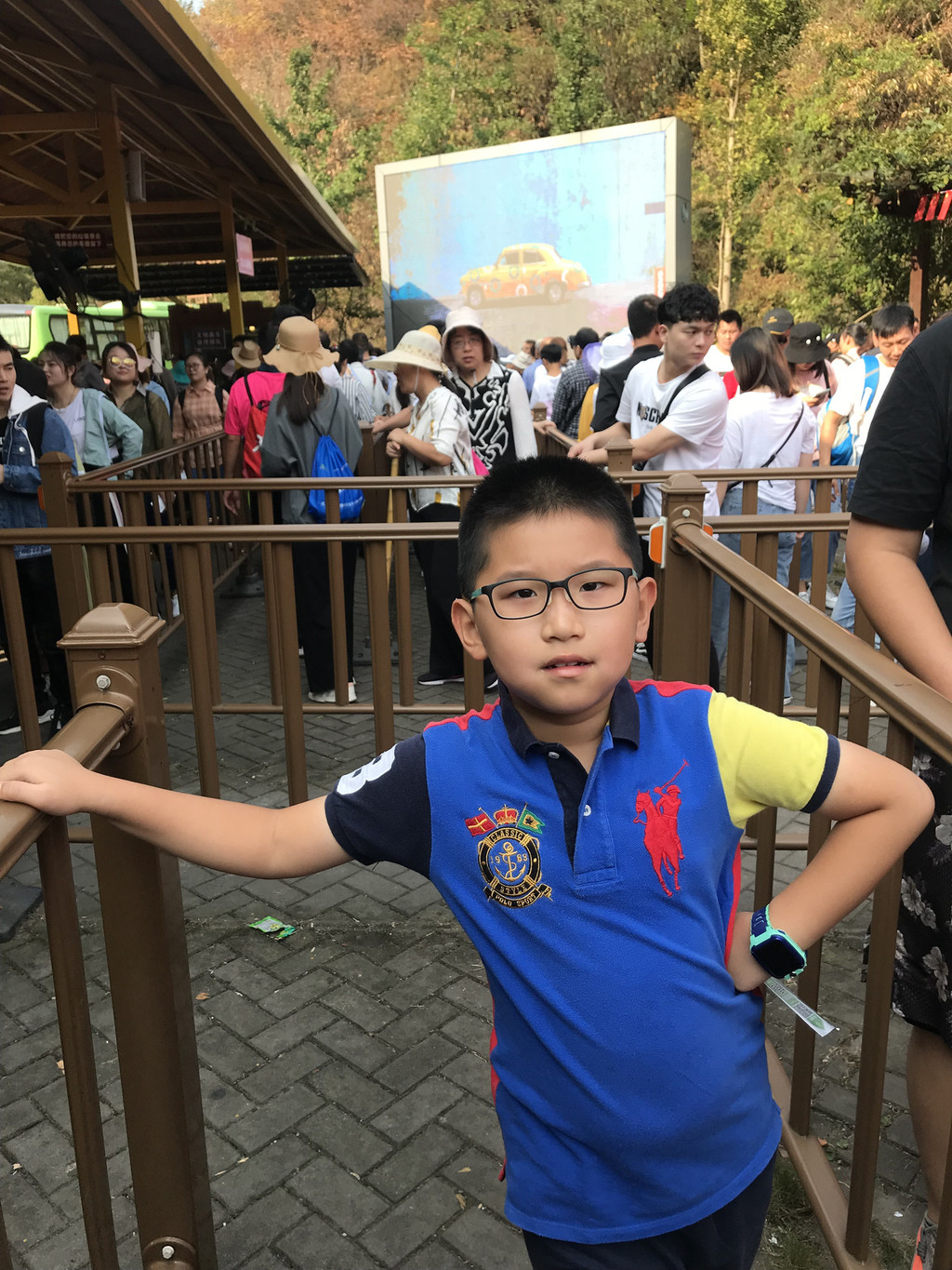 长长的排队人流,等候乘坐景区巴士进山