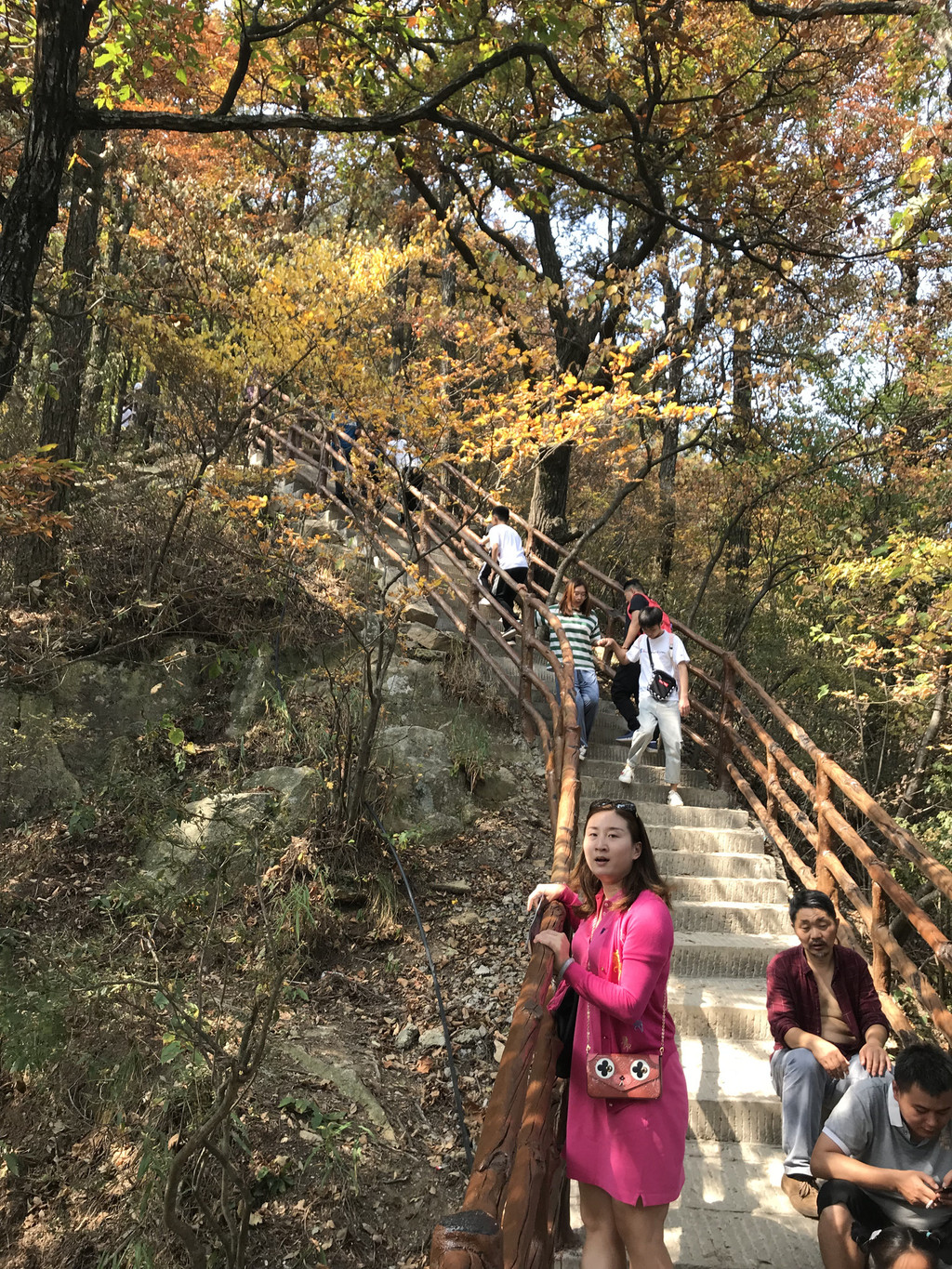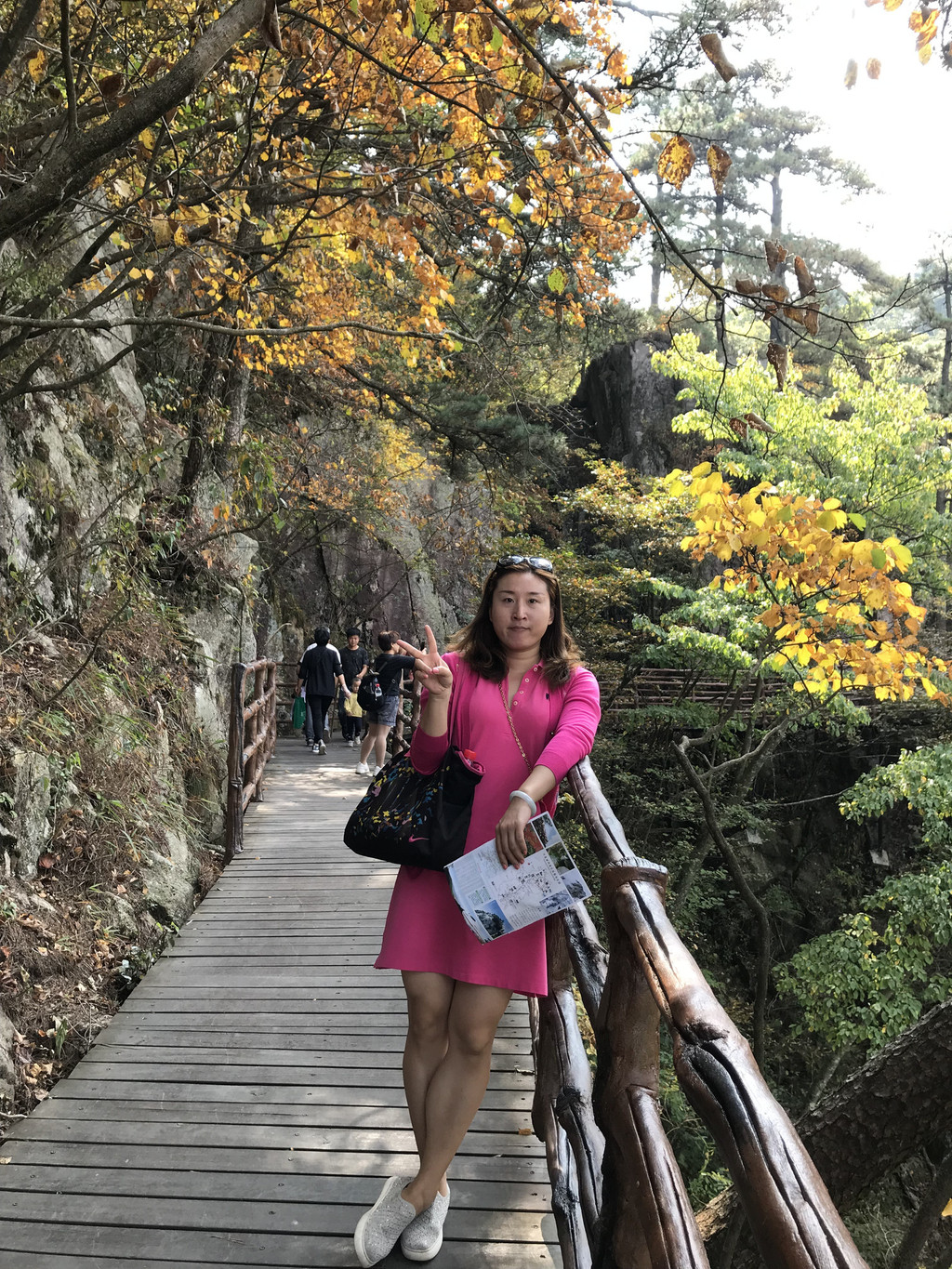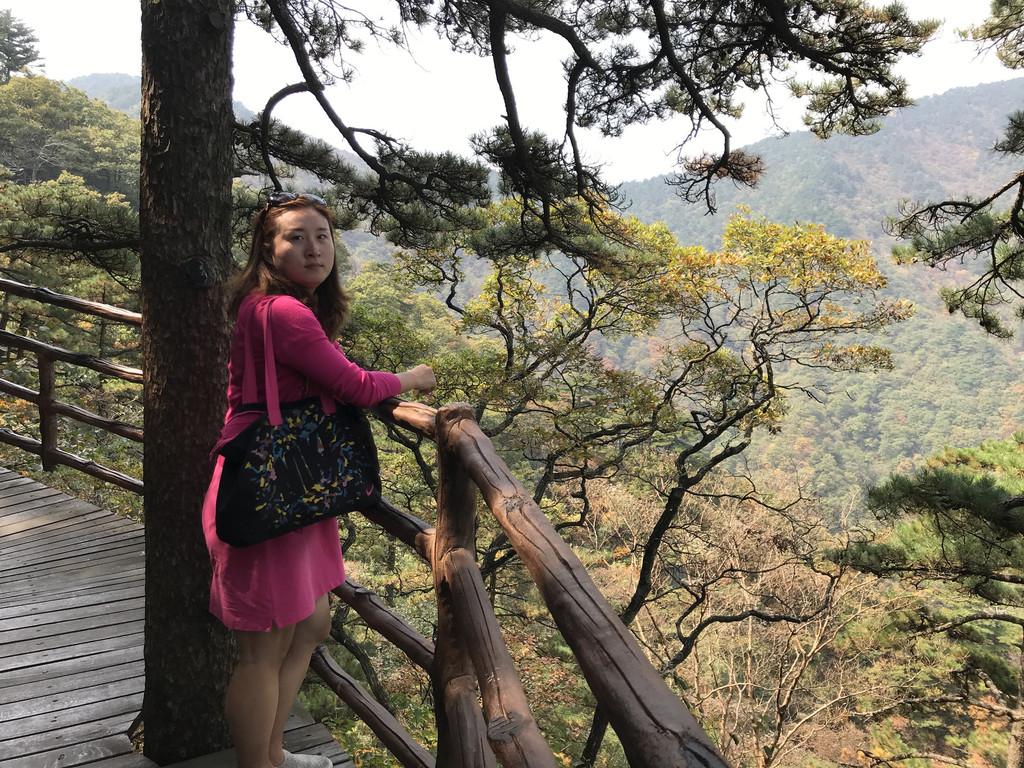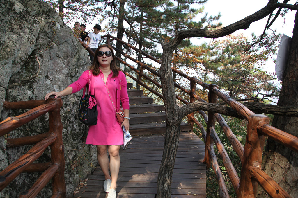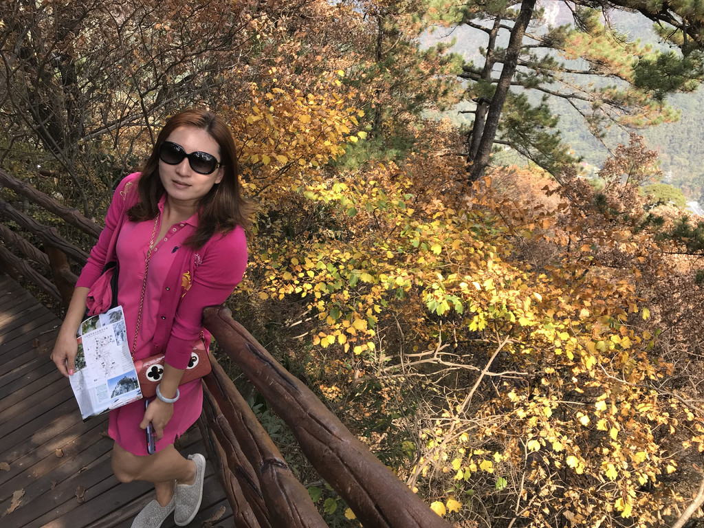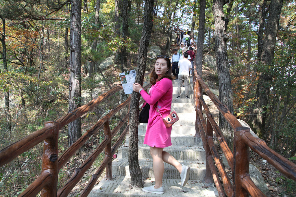 泻玉瀑有两个方向登山顶,一是继续前行,走冰晶瀑、银弓瀑、天池登山山顶这条线,这条线比较难爬,山路崎岖、道路艰险;我和娘子选择的是第二条,即右拐向上走龙剑峰到天屏峰、天池、山顶这条线,这条线的好处就是自然景观比较丰富,沿途都是搭建的人工栈道,顺着山势地形,高低起伏忽上忽下。