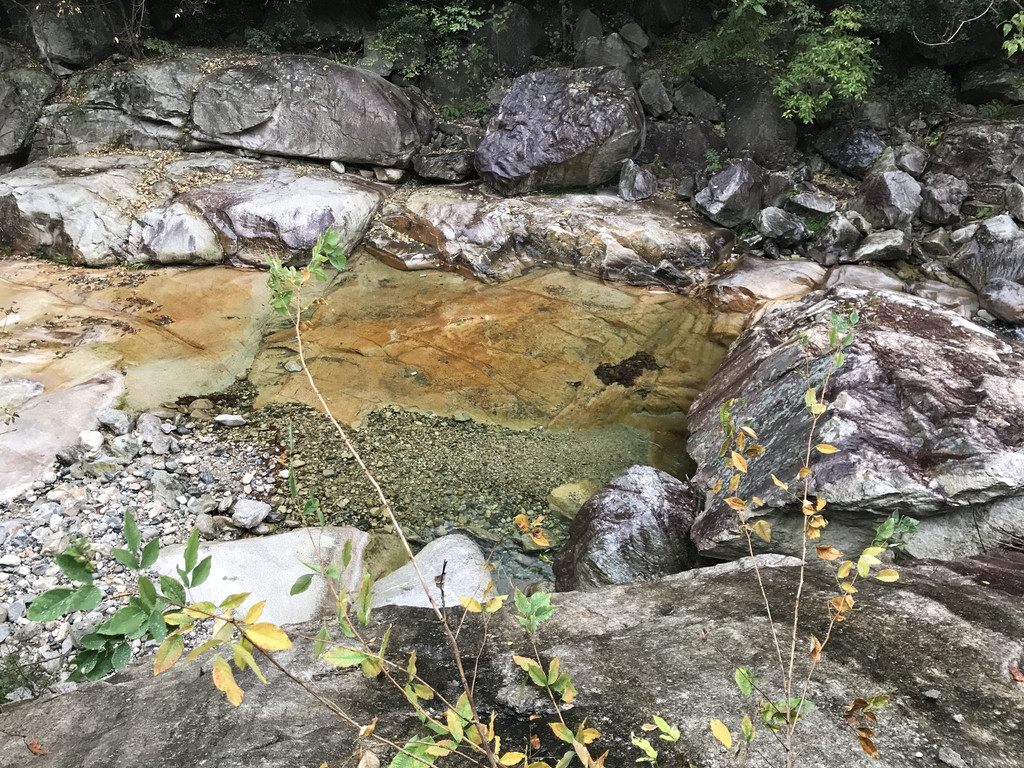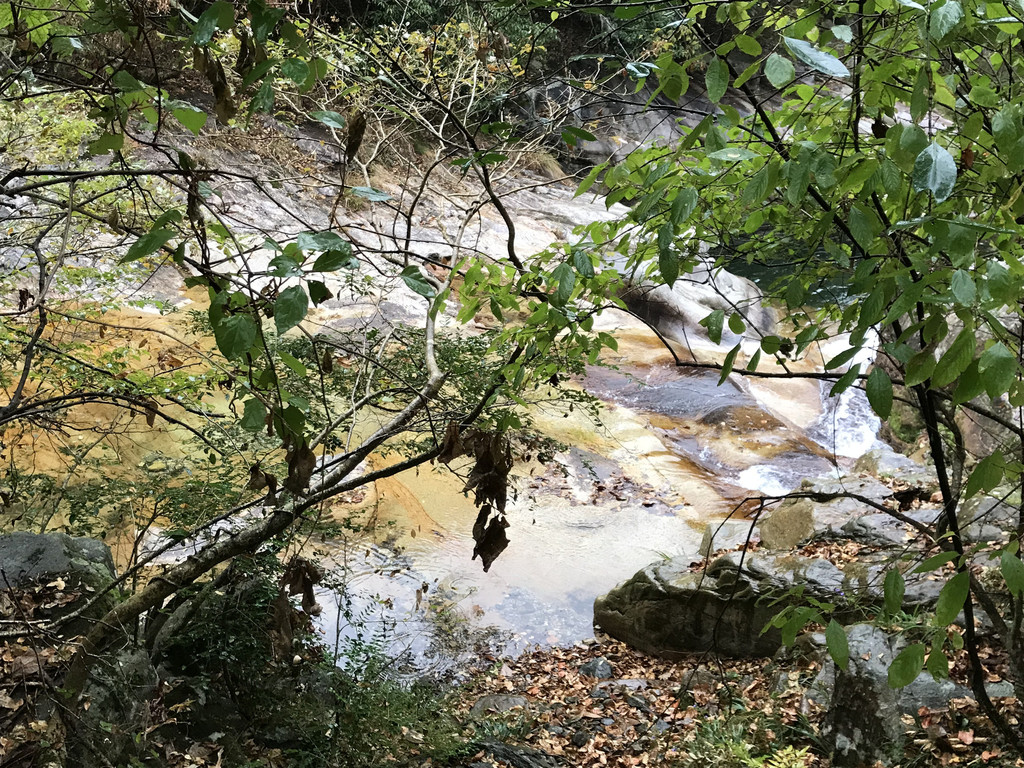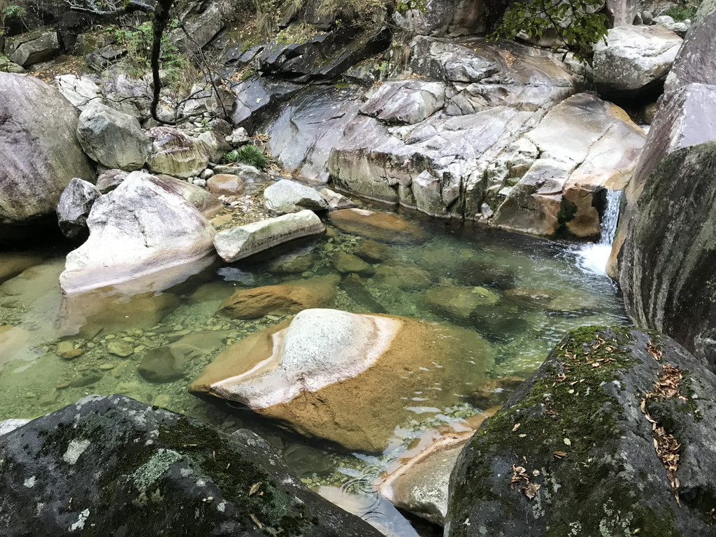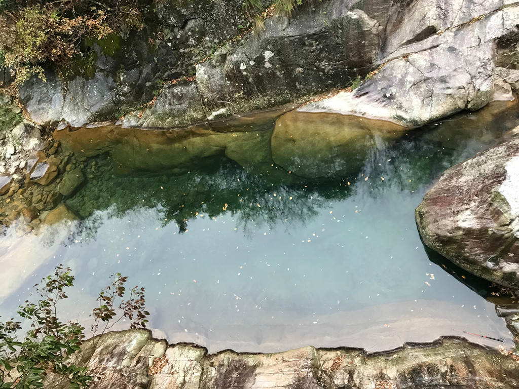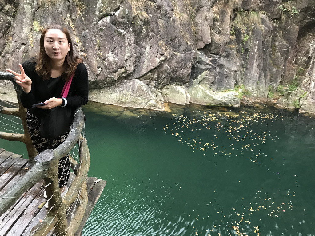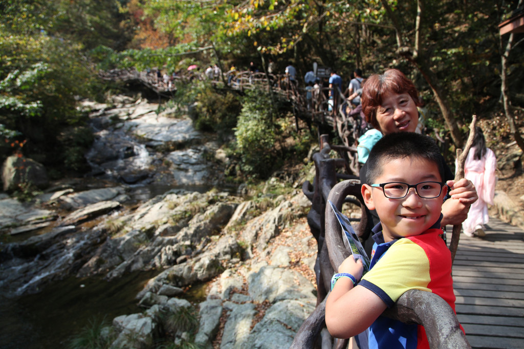 一不留神我的镜头盖,掉到了桥下,龙太子热心地帮我定位,确定镜头盖在水里的位置,我则小心地越过围拦,下到谷底去捞,折腾了好一会,才算捡回了镜头盖。在这里,龙太子和外公外婆决定不再继续前行,掉头往回撤了。