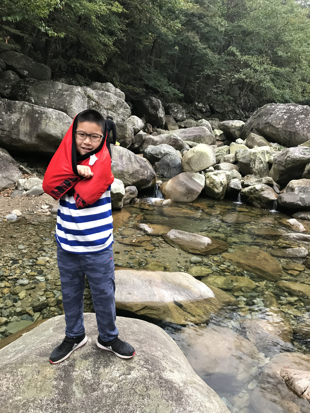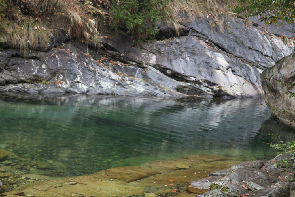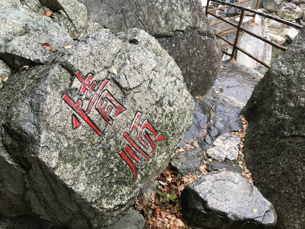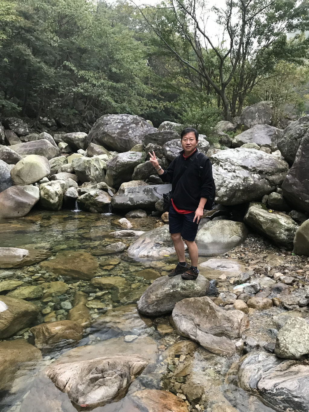 一不留神我的镜头盖,掉到了桥下,龙太子热心地帮我定位,确定镜头盖在水里的位置,我则小心地越过围拦,下到谷底去捞,折腾了好一会,才算捡回了镜头盖。在这里,龙太子和外公外婆决定不再继续前行,掉头往回撤了。