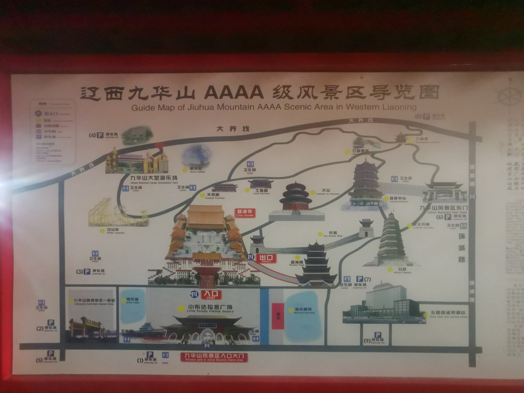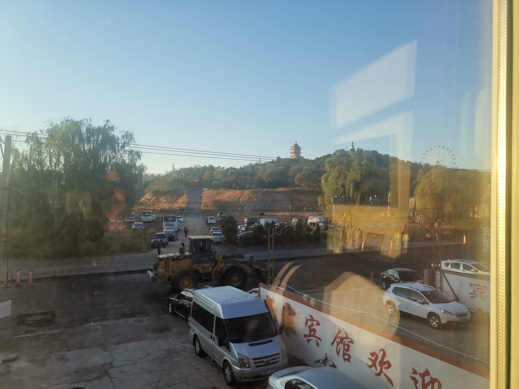 第一晚订的宾馆在九华山公园的北门对面,从东门停车场过去不过十分钟的路程,临近宾馆正在修路,车停在宾馆门前里面已经停放了2层车,我们的半个车屁股停在修路的路基上。宾馆老板建议我们把车停在对面的公共停车场里,这样早上就不用挪车了。