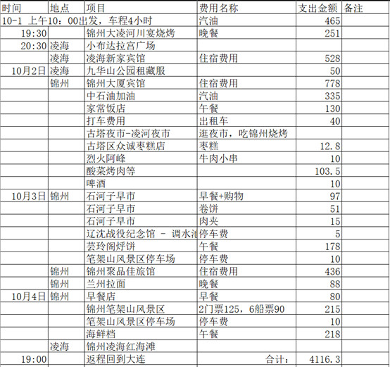 其中住宿费用是最大的开销,三晚的住宿1742元,其次是1244.3元的餐费,然后是油费800元,全程的门票费用125元(只在笔架山景区买了门票),笔架山快艇的费用90元,其他还有些租服装/出租车/停车费等杂费。