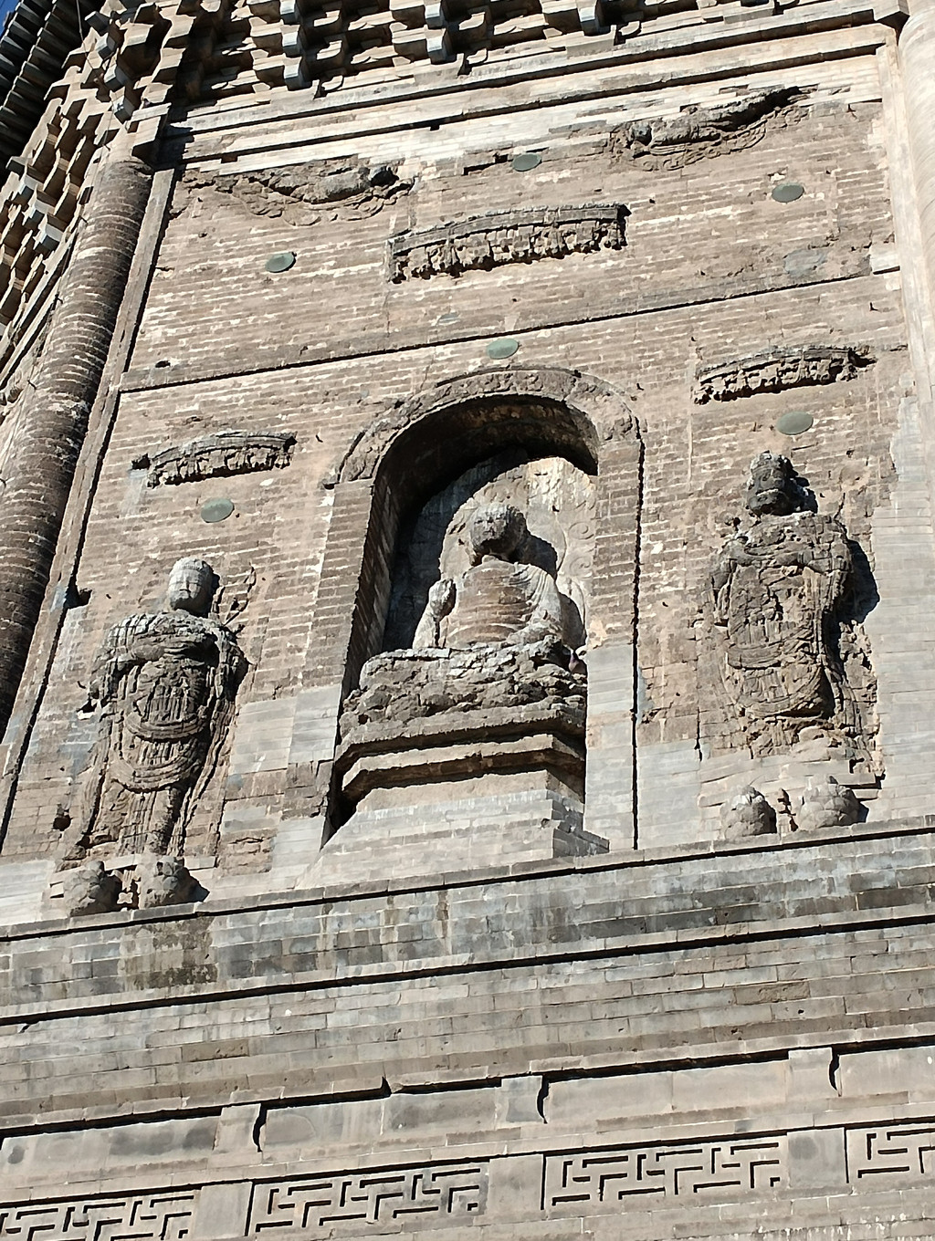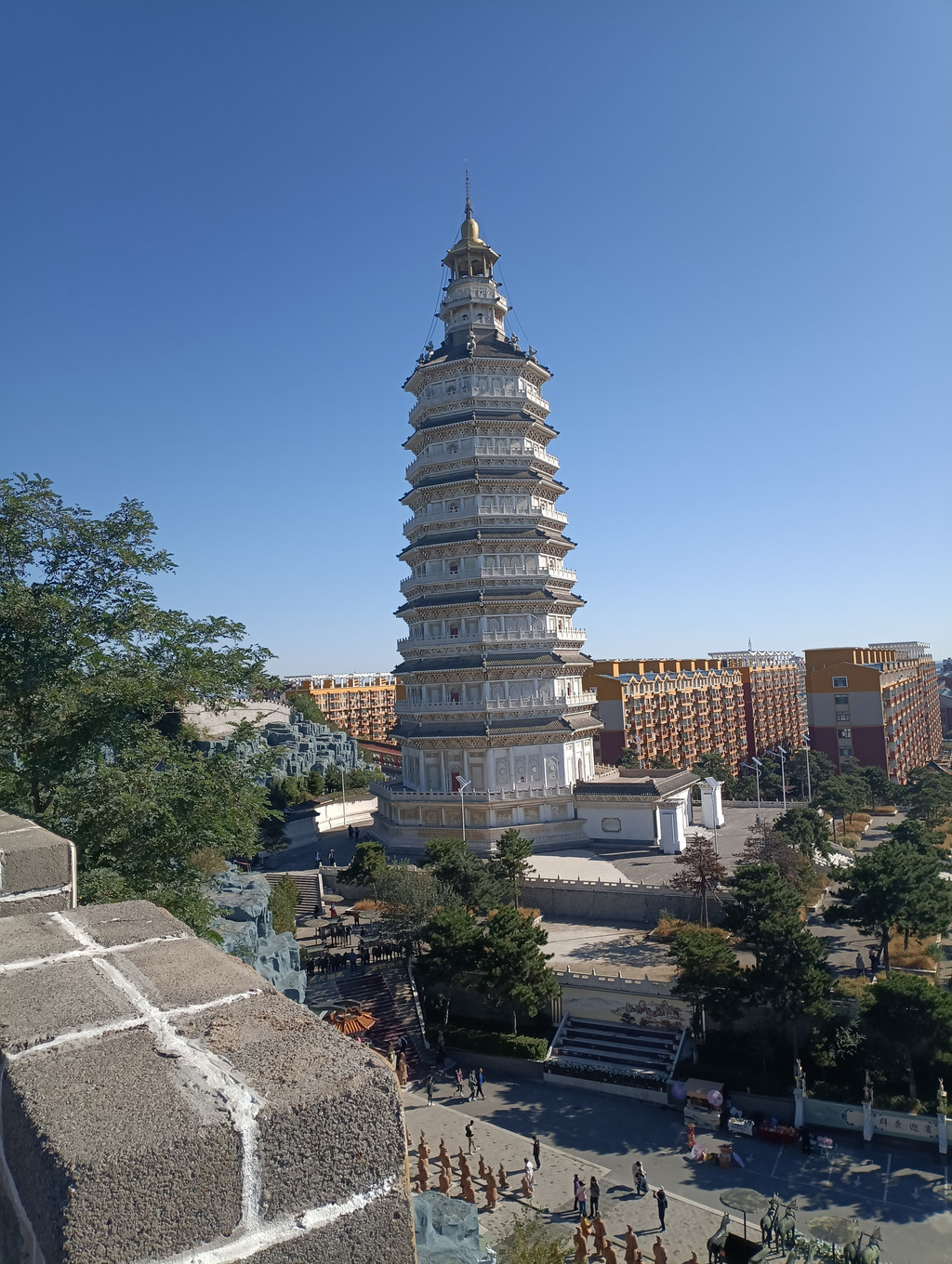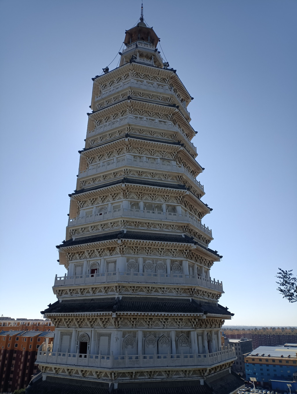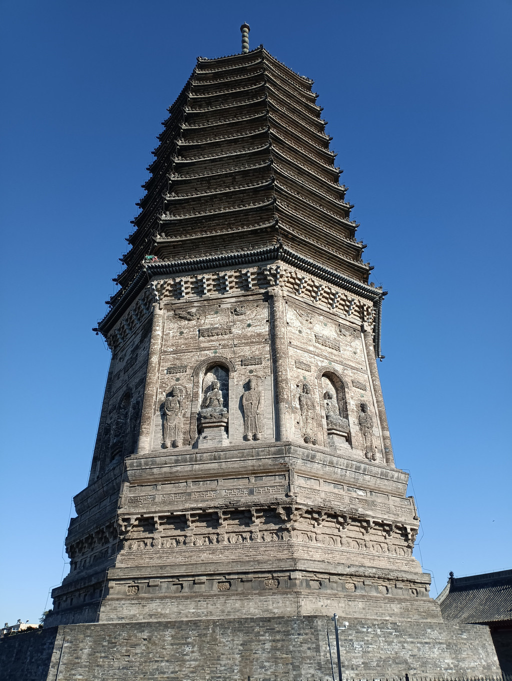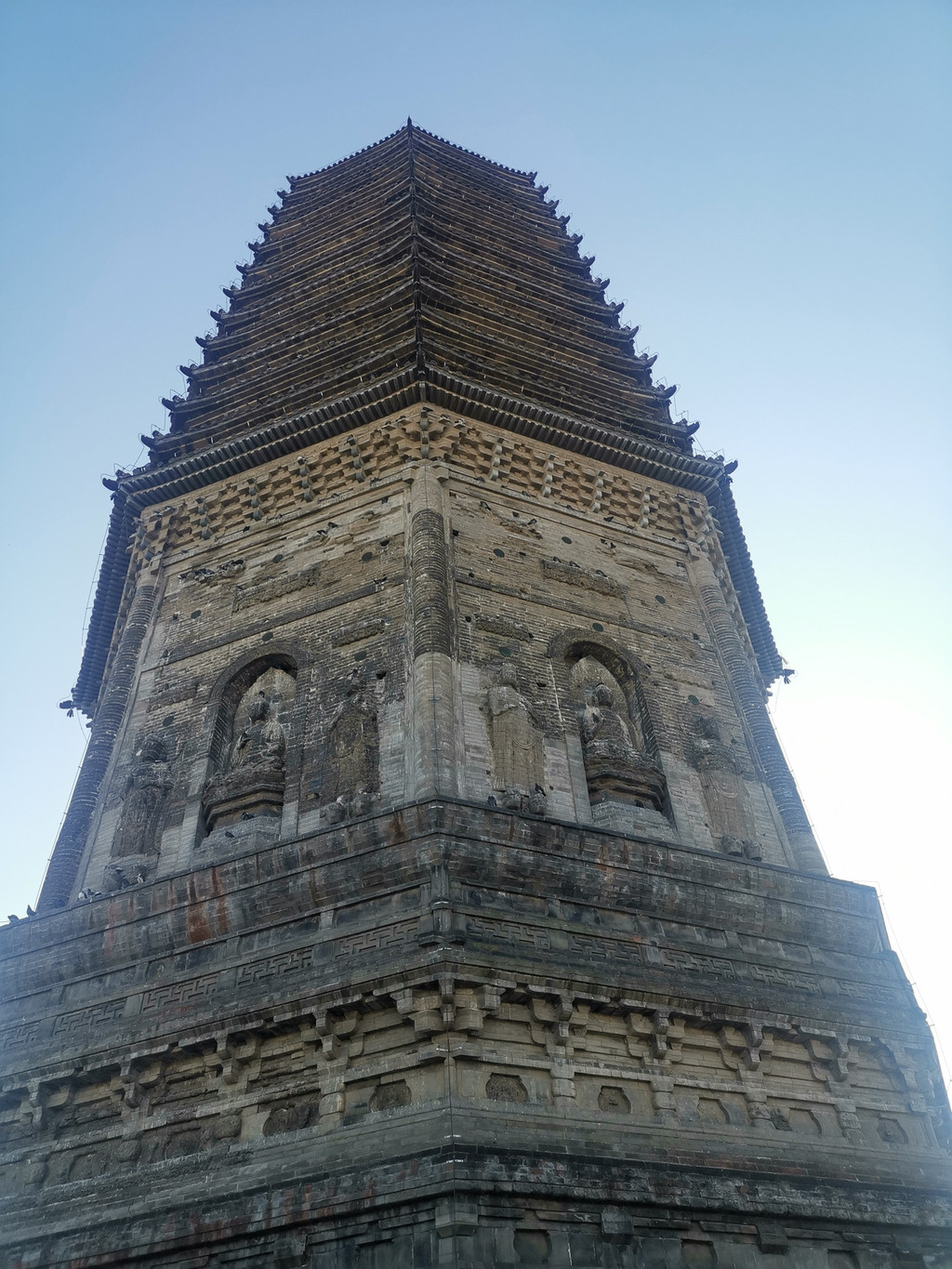 八角砖形的辽塔高13层,塔身各面都砌有拱龛,内置坐佛。塔顶宝顶镏金,亮丽夺目。