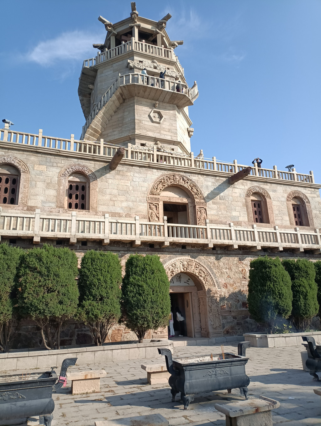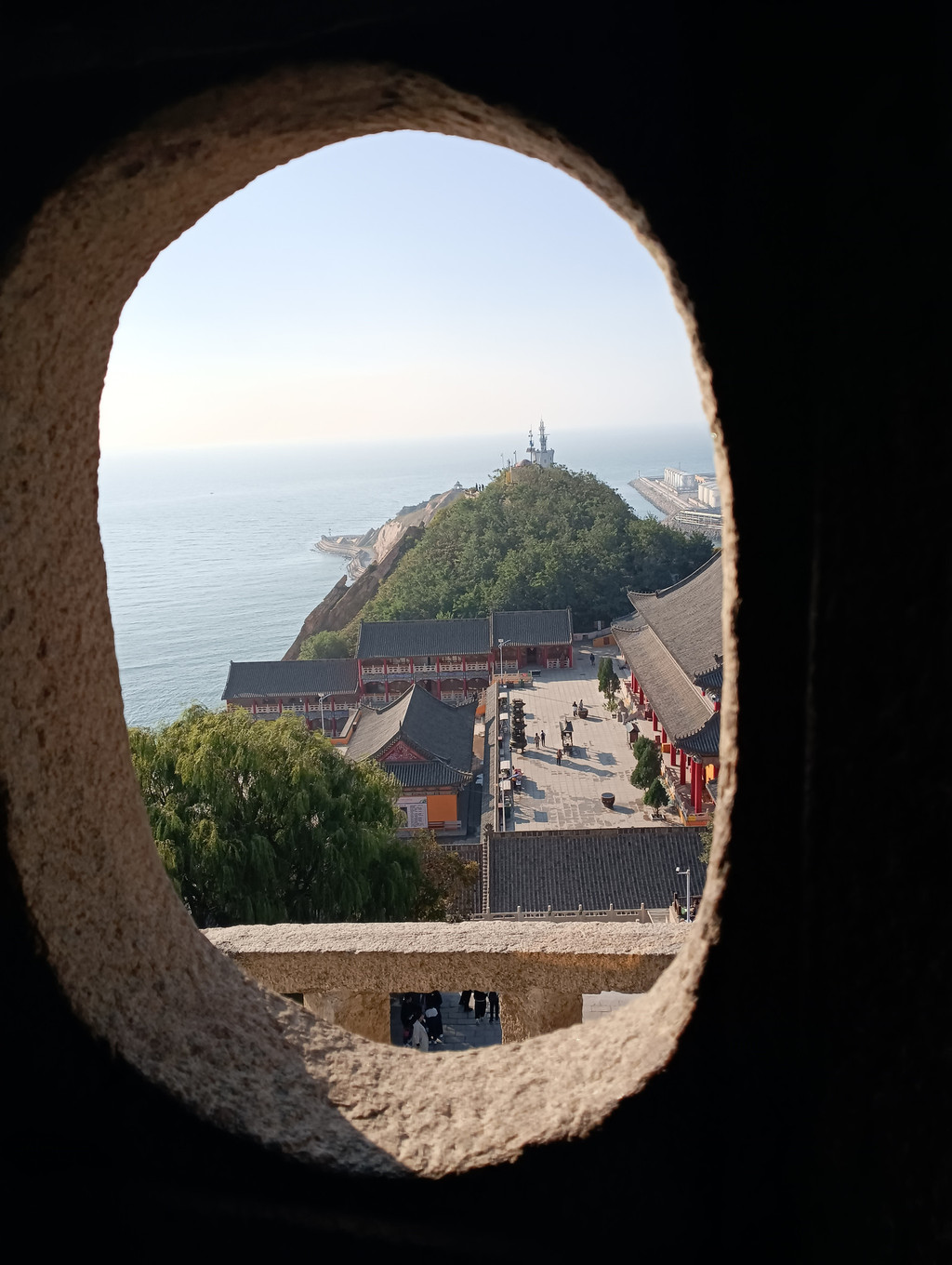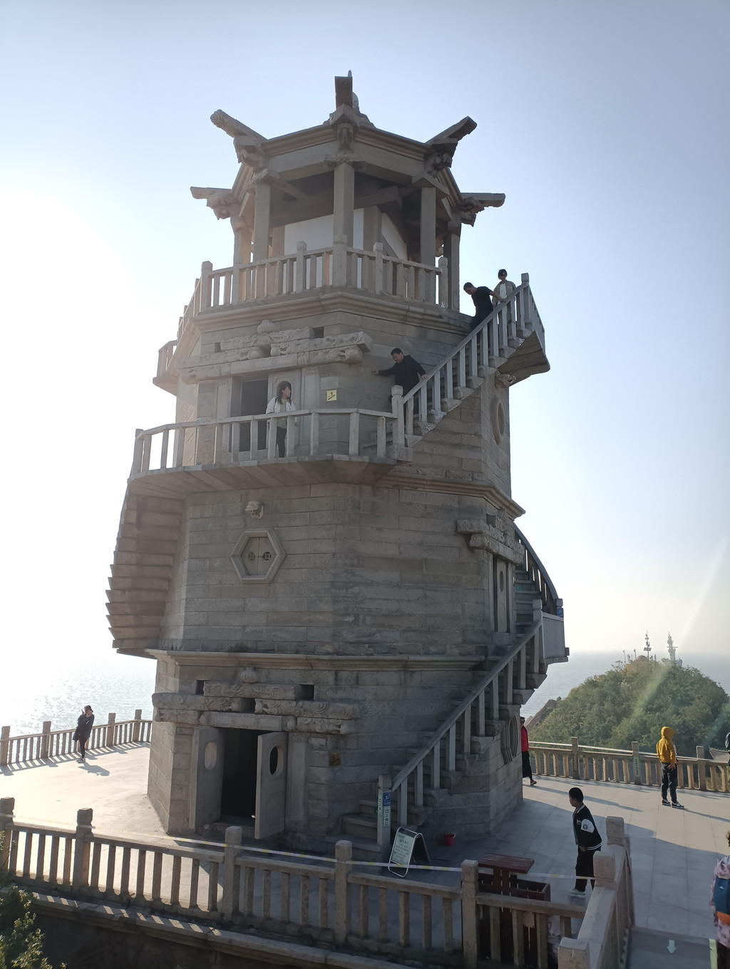 背景资料:笔架山位于辽宁省的西部,面对渤海,毗邻锦州湾,是一个近海中的一个连陆小岛,也是著名的道教胜地。笔架山有三个峰,二低一高,因形如笔架因此而得名。山上悬崖峭壁奇秀,自然风光迷人,自下而上建有山门、真人观、吕祖亭、五母宫、三清阁等众多道教庙宇及点缀品,其中以主峰之上的三清阁尤为精美。