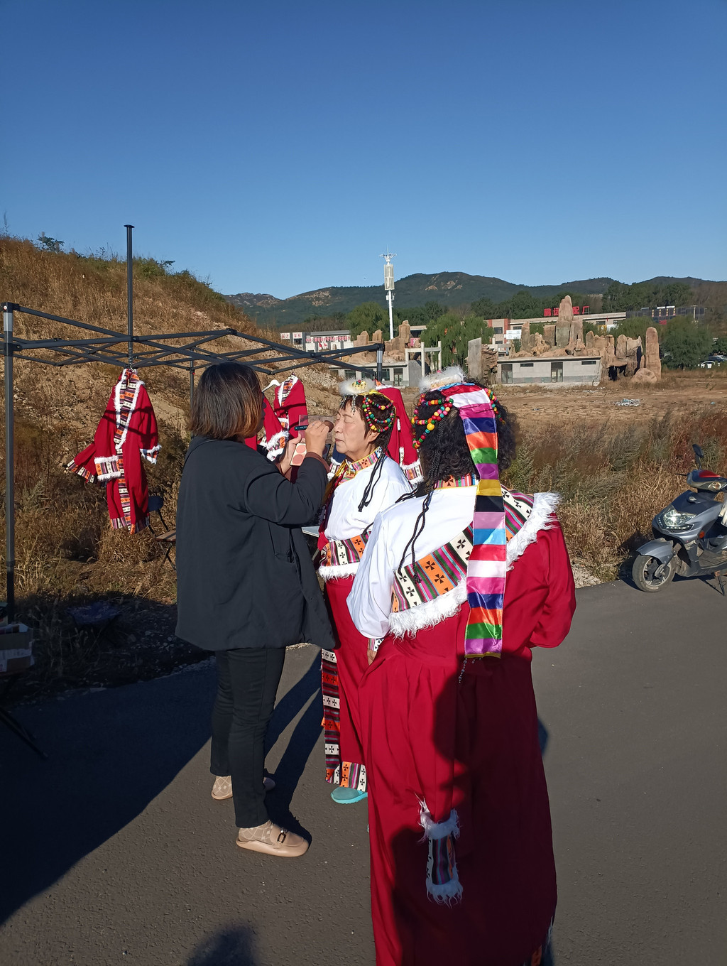 和景点住的近真是方便,过了马路是我们的公共停车场,往山上走几十米就是九华山景区的北门了。门口有一个租藏服的正在出摊,我们给2位母亲50元租了两套藏族服装,没想到还提供免费化妆呢。