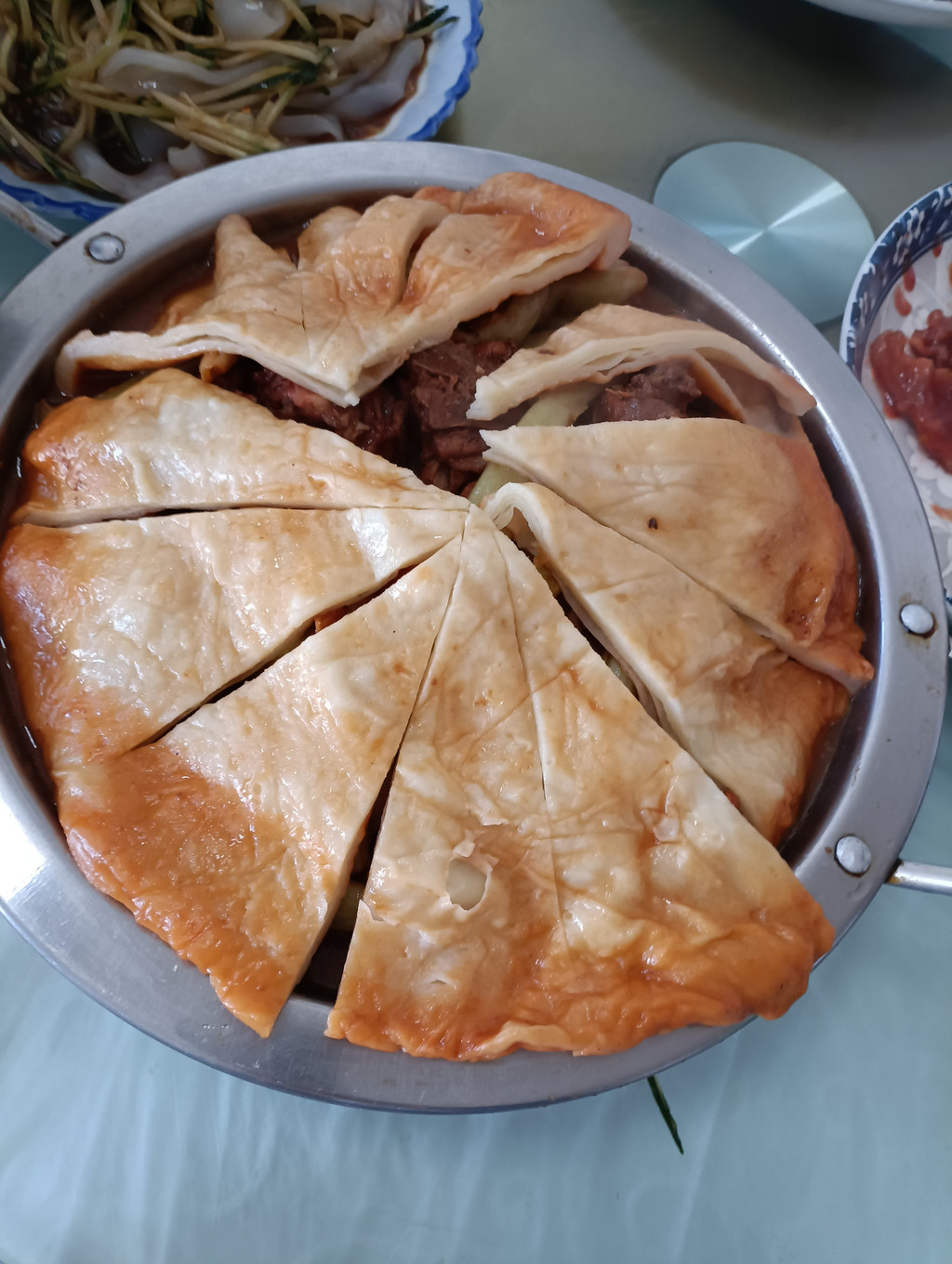 话说到了午餐时间,我想吃锦州的另一名吃”焖饼“,打电话联系了几个有名的店都是满员,需要等1小时左右。情急之下选了附近的一家焖饼店。
