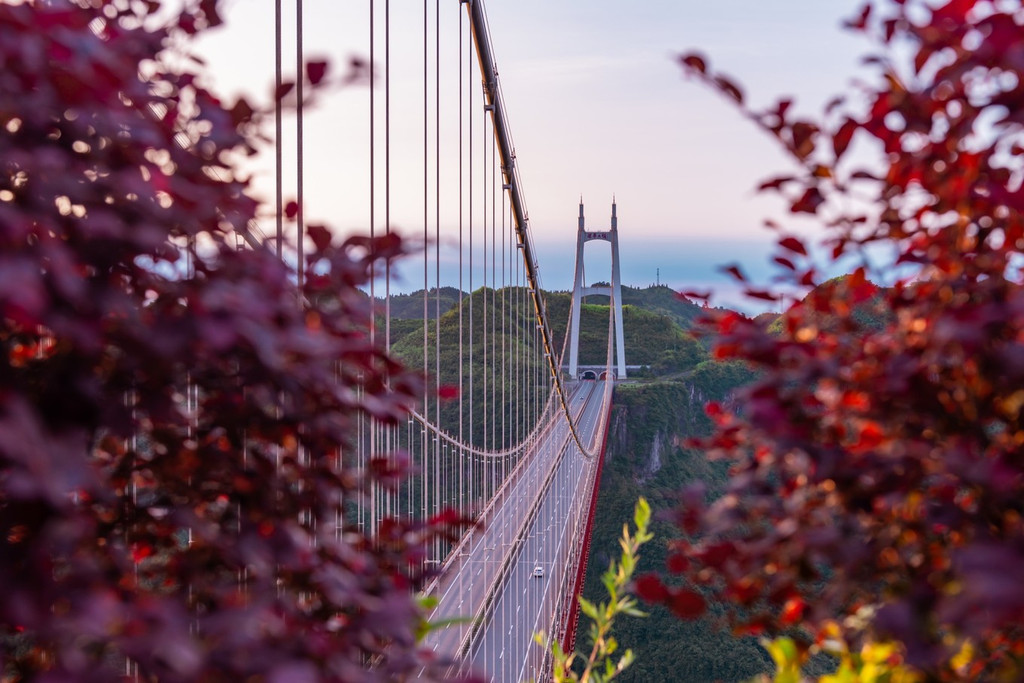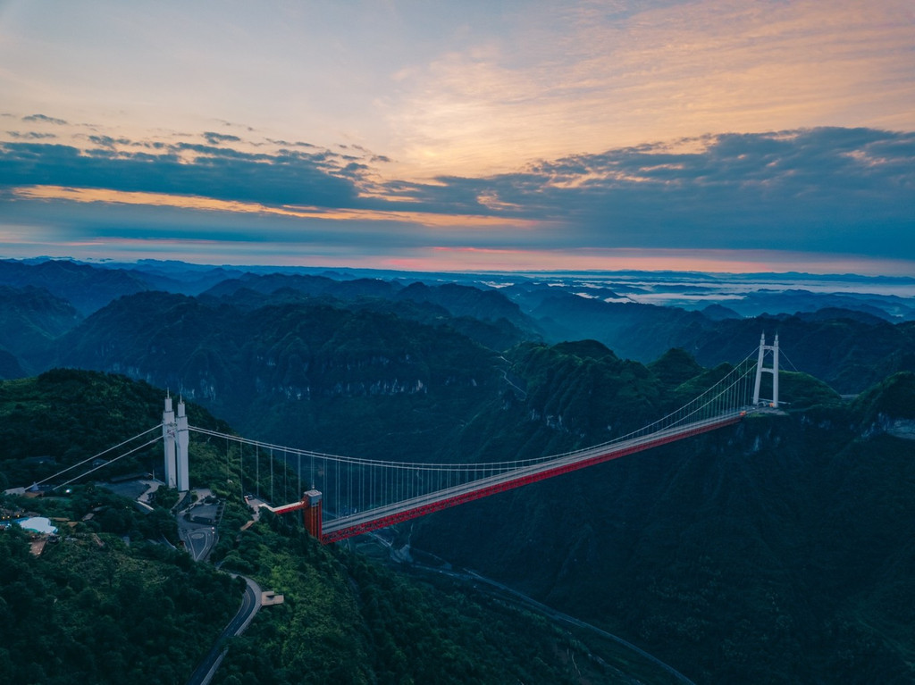 1⃣️矮寨大桥:是包茂高速(G65)跨越德夯大峡谷的一座特大型桥梁,此桥地处云贵高原和沅麻盆地交界处,地势险要,桥梁建设中当时创下了四个“世界第一”。