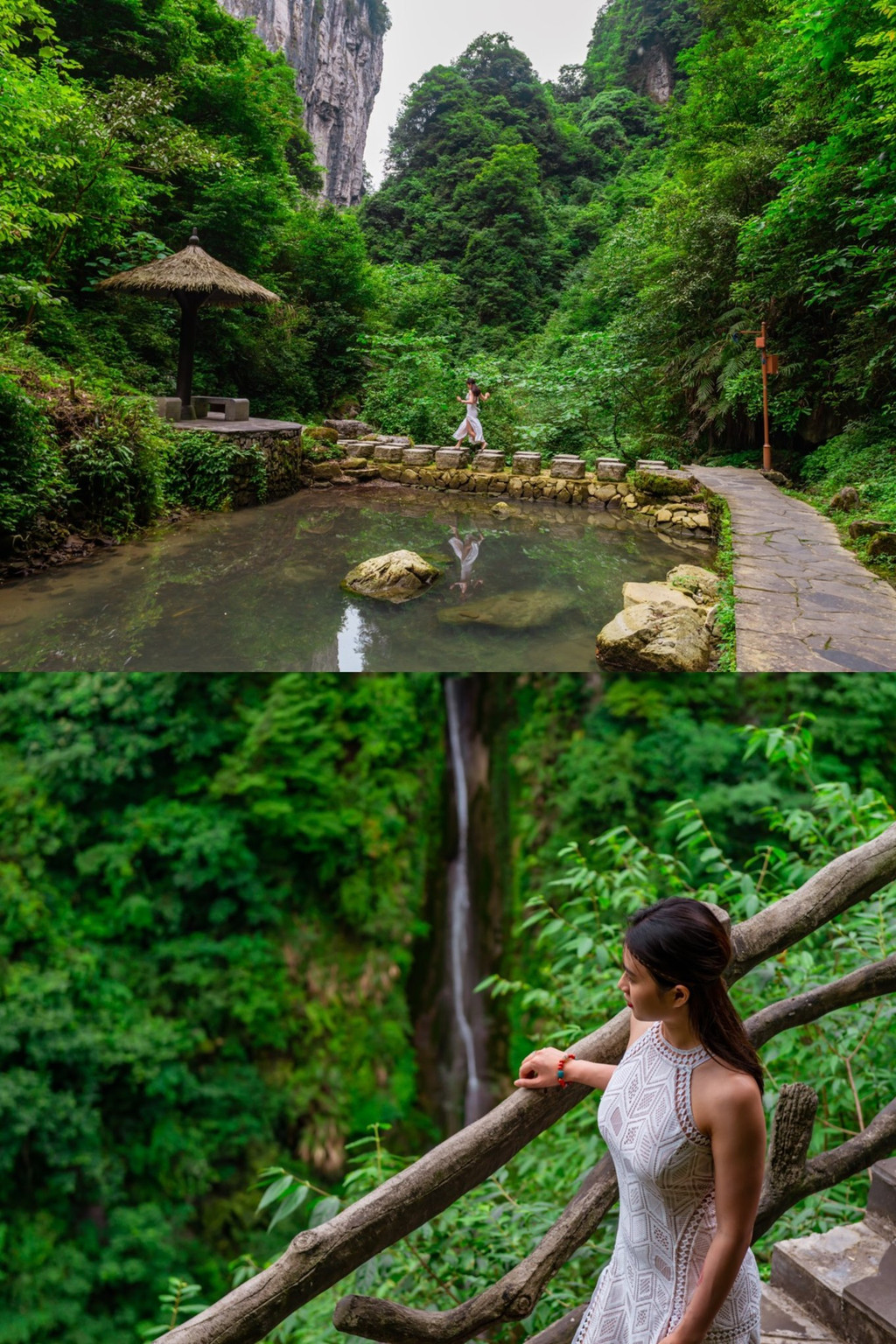 8⃣️玉泉溪峡谷:从天问台下来就是玉泉溪,之字形栈道从山上到山脚要走一个多小时,体力不行的也可以选择从吉斗苗寨坐车到德夯苗寨,然后进峡谷游玩。整个玉泉溪空气清新,环境清幽,瀑布悬挂,奇石峥嵘,还有一潭碧路碧绿的泉水,超漂亮!