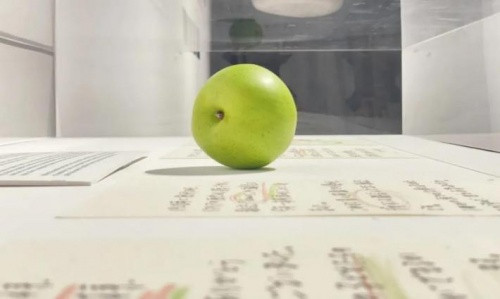 本次展览,展出了安藤先生赠予郭德英先生的亲笔信件与签名版“青苹果”。而面对“诗之韵”空间的,则是首颗正式落位中国的安藤忠雄“永远的青春”青苹果艺术装置。这颗巨大的“青苹果”雕塑表达着安藤忠雄先生对于青春的理解——不怕失败,永远充满热情的生活。保持年轻的心境,就能拥有一场永远的青春。