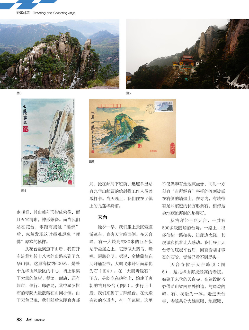 早在1995年,中国邮政发行了《九华胜境》特种邮票。“天台晨曦”、“百岁禅宫”、“肉身宝殿”、“祗园夕照”、“大鹏听经”和“凤凰古松”6枚邮票把佛国圣地的庄严和空灵展现得淋漓尽致,让我们对九华山心生神往。2018年春节期间,我们早早开车从宁波出发,中午时分就到九华山花台景区,开始了礼佛、觅邮。