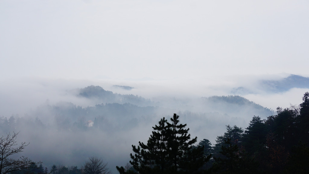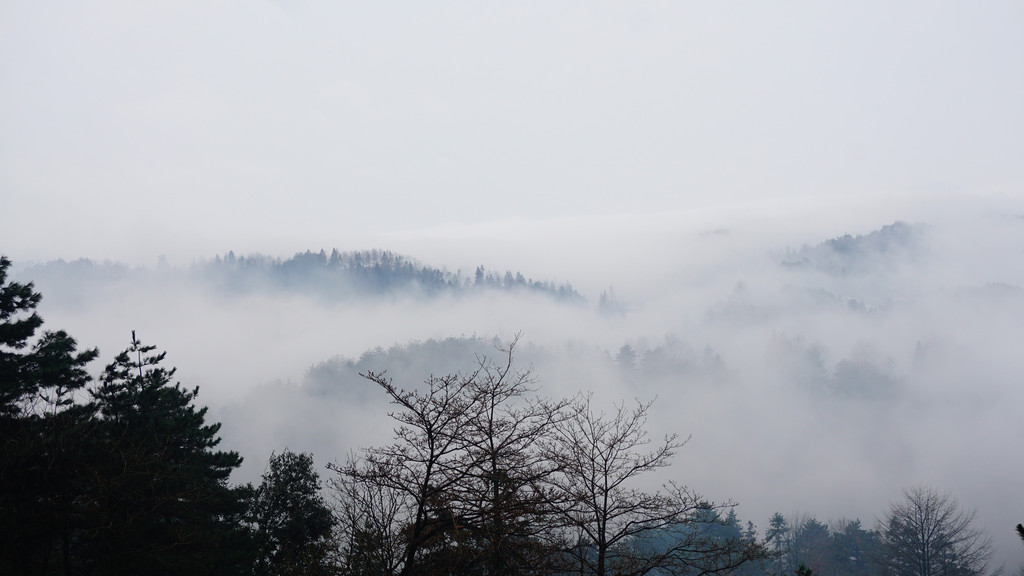 顺着祗园禅寺的围墙走到尽头,步行登上摩天岭,山与雾,雾与云融为一体。烟消云散时,回头俯瞰,九华街的全貌呈现于眼前(图12)。不一会儿,烟云又至,小镇又消隐在云里雾里。