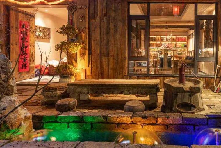 进店门口的一对大门是近百年的老古门原式样安装,风格独特。外墙壁是用老木板的木饰面挂靠装饰,凹凸立体感强,门口还有一口老石框手压老水井,可供来客者打卡,门口老石台是千年自然形成的化石,水浇湿石台后,虫形化石印记历历在眼前,时光回往火山千万年后造就成眼前的虫形化石即在眼前。