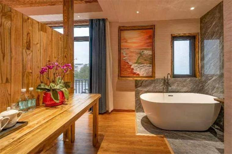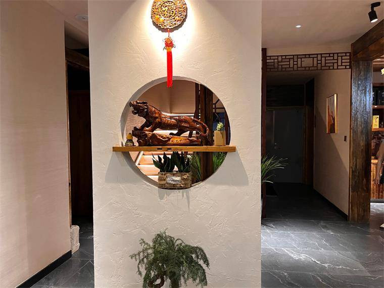 大厅和室外装饰以老木料、老木头、老石座、老石墩为主,设计理念突出“朴”为主题,不经修饰,原计原味风格,淳朴而厚实质感,大厅茶桌和吧台是老榆木门板材料建成的,突出“朴”而不飘,具有强烈的沉淀厚实感!特别有一种云南感,古里古气,木质结构与全屋智能的现代科技相结合竟然一点违和感都没有。