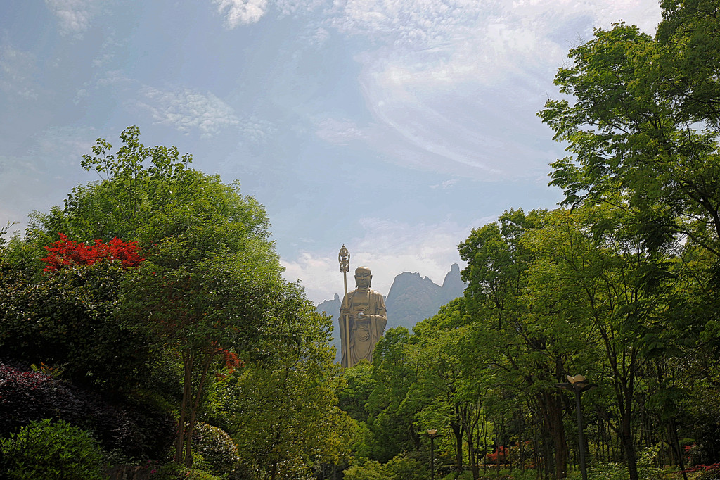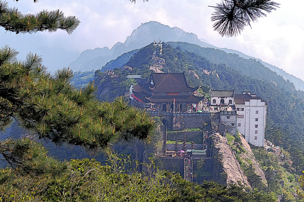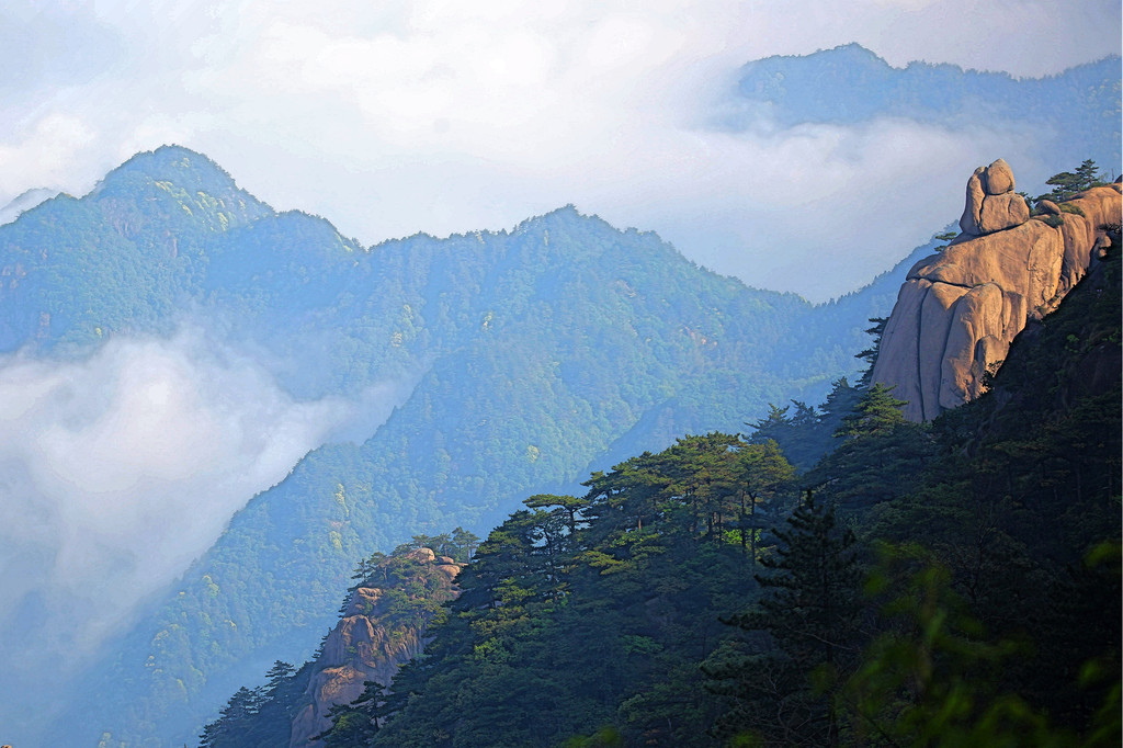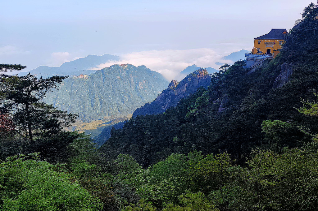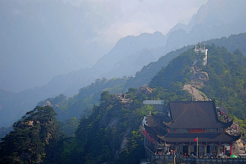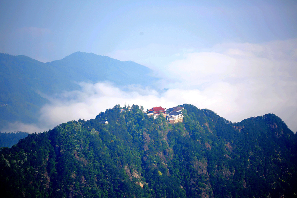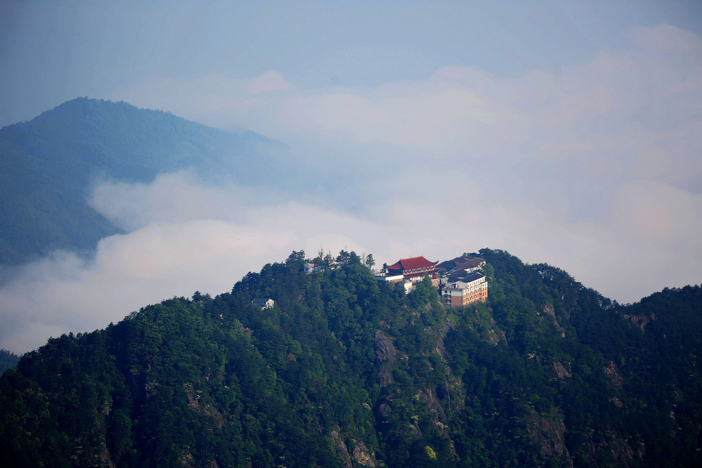 从索道下来没走多远,眼前景色便令人陶醉。远山青黛,白云缭绕,九华山作为黄山余脉,颇具黄山韵味。