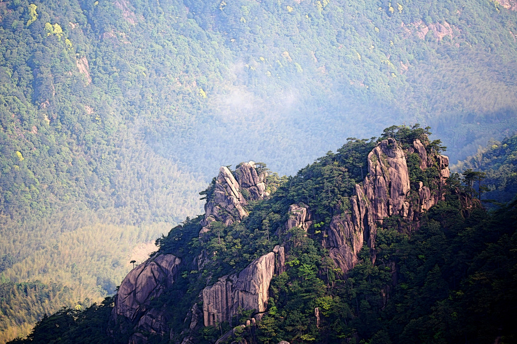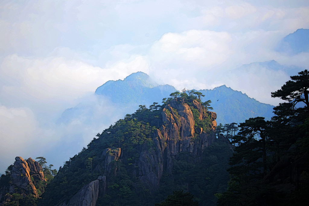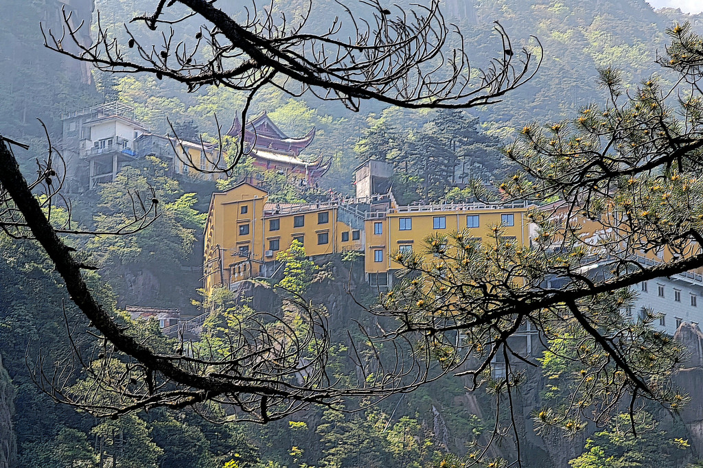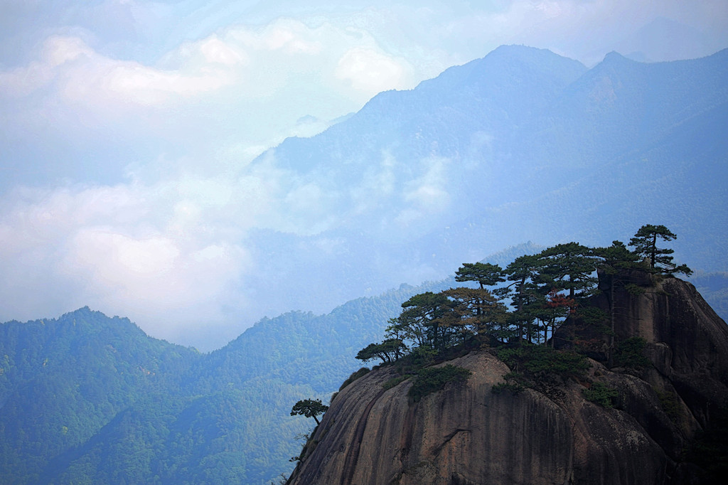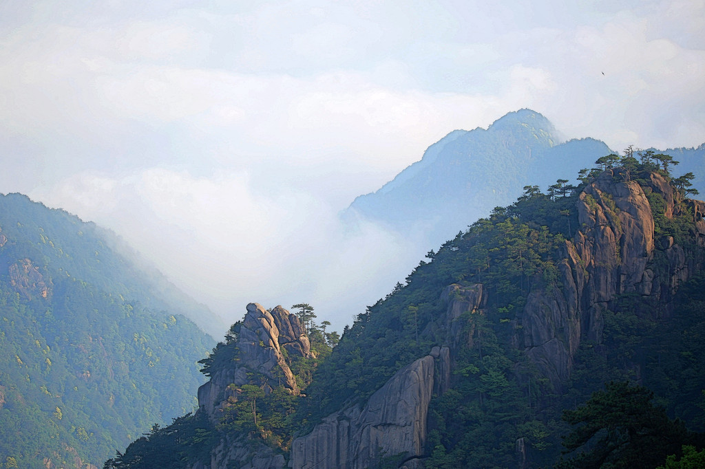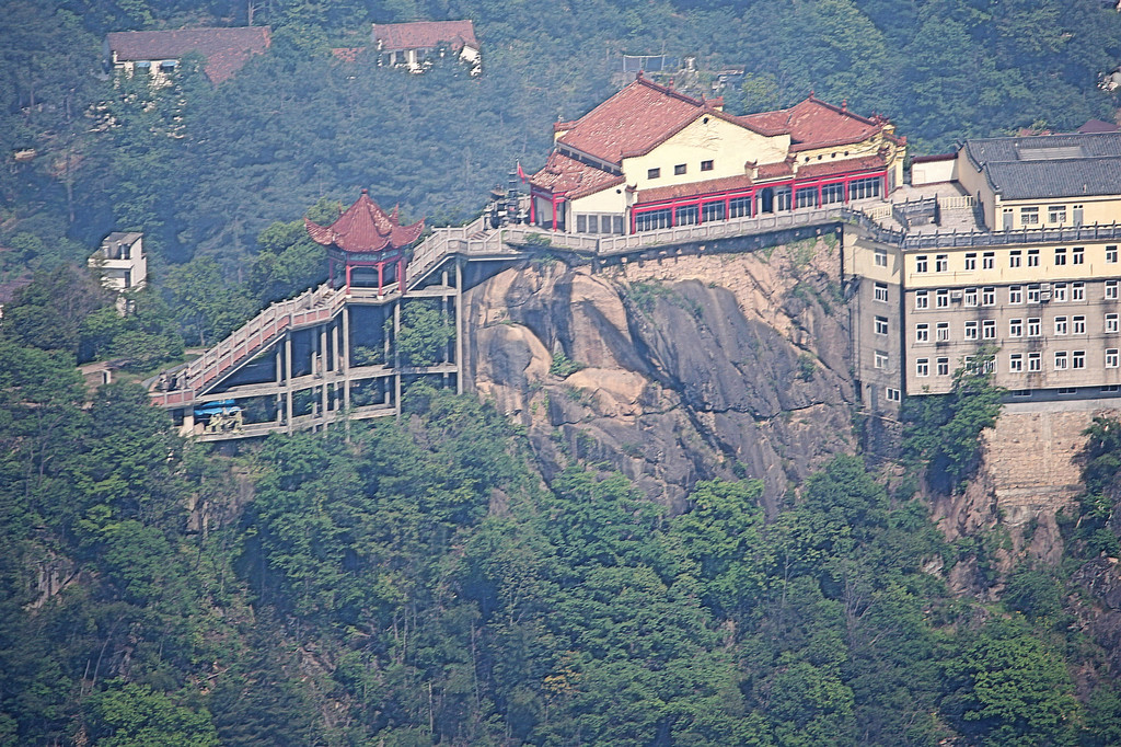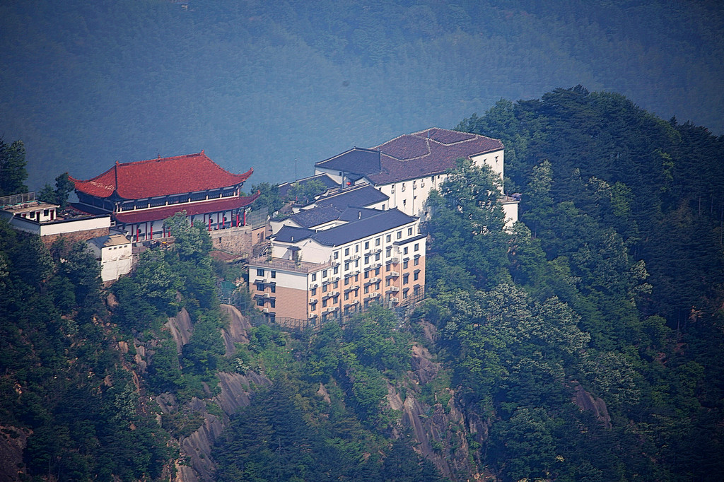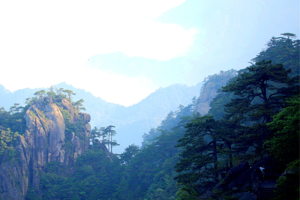 从索道下来没走多远,眼前景色便令人陶醉。远山青黛,白云缭绕,九华山作为黄山余脉,颇具黄山韵味。