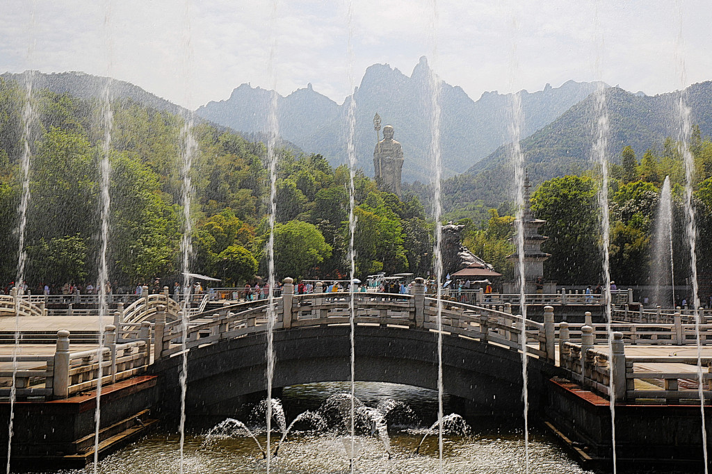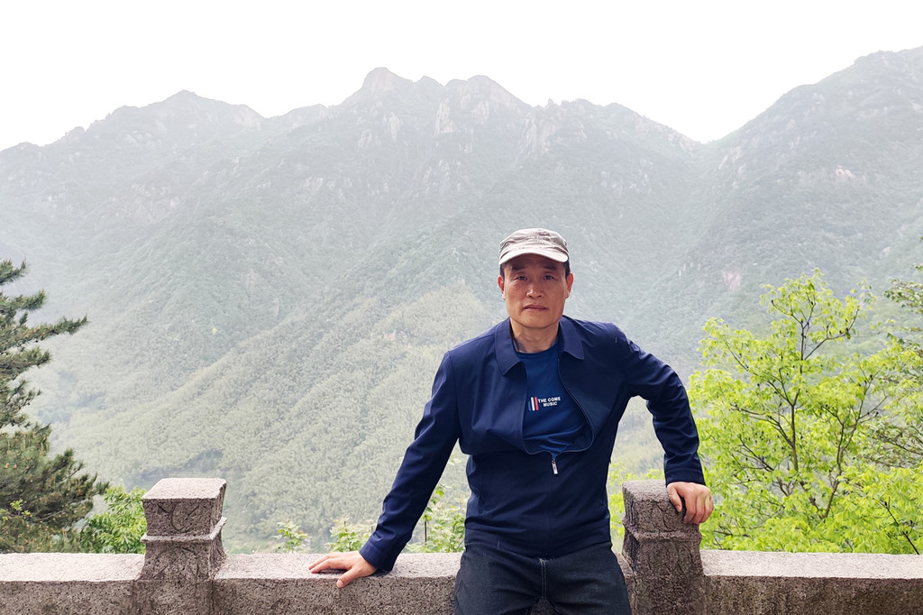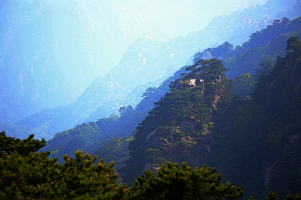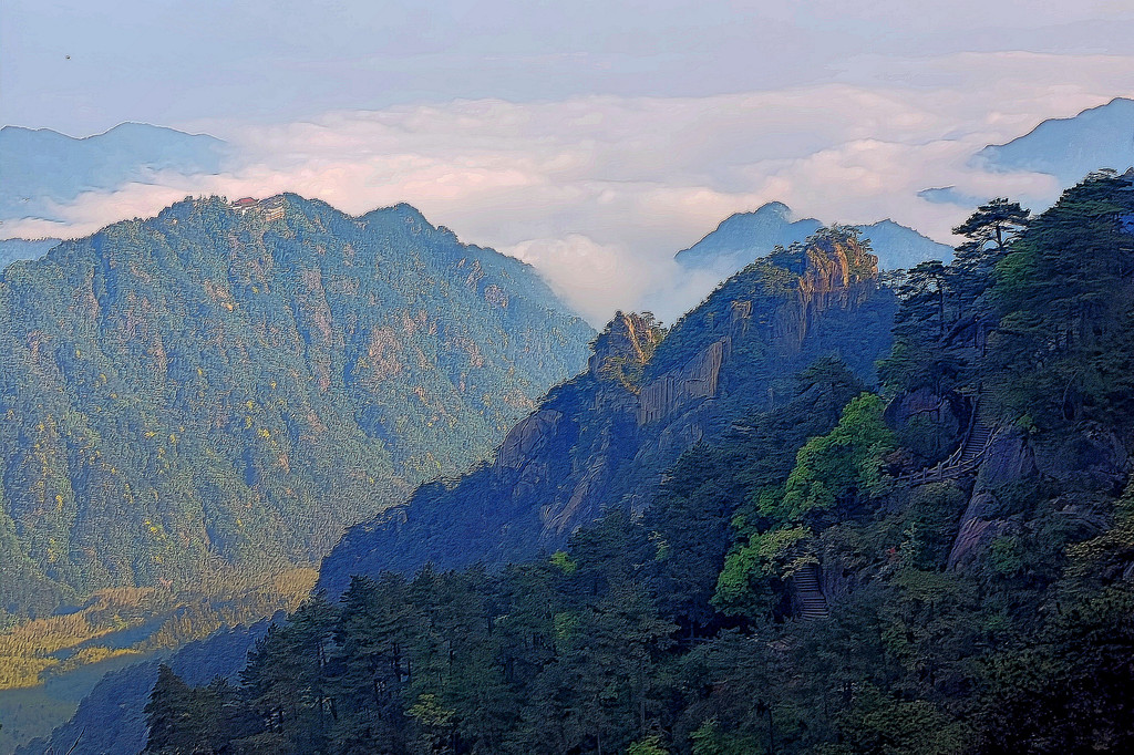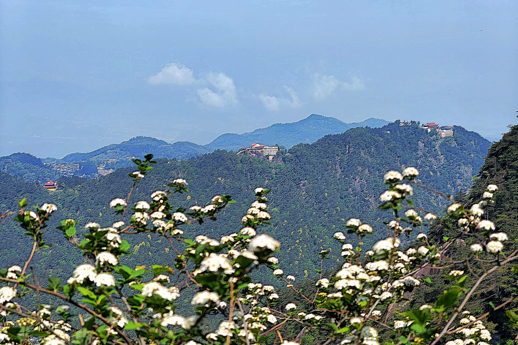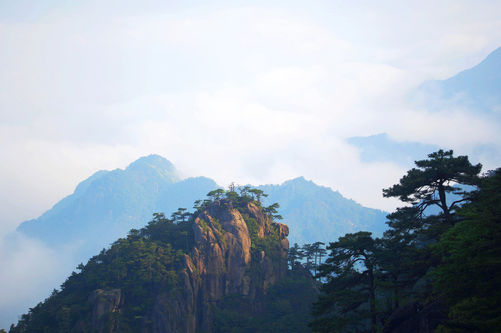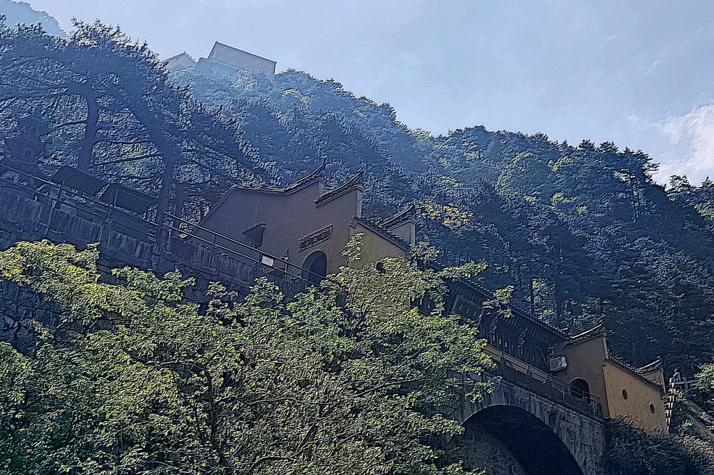 从索道下来没走多远,眼前景色便令人陶醉。远山青黛,白云缭绕,九华山作为黄山余脉,颇具黄山韵味。