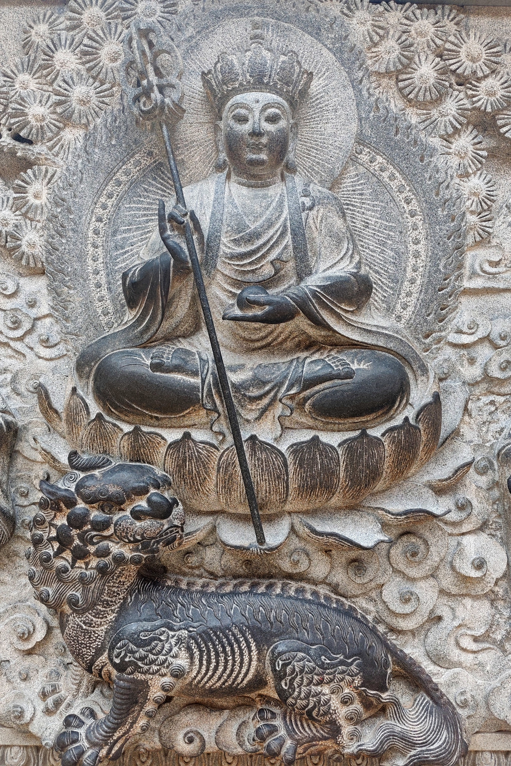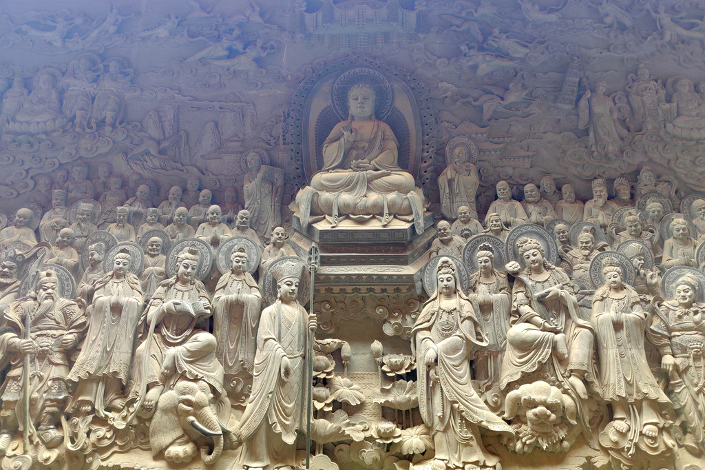 大愿宝殿与华严宝殿风格类似,殿堂前有八根青石龙柱,为深雕浮刻,每柱有两条龙对迎而翔,盘绕升腾,中间刻有宝珠为伴,龙柱两两相对,各具其形,造型优美生动,龙姿栩栩如生。殿内供奉 9.9 米高的四面地藏王菩萨。