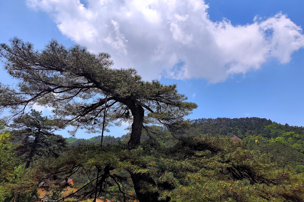 11:30 左右,我们终于抵达山脚的凤凰松。九华山凤凰松被誉为 “天下第一松”。松高 7.68 米,胸径 1 米,造型奇特,恰似凤凰展翅。主干扁平翘首,如同凤冠,两股枝干一高一低,状似凤尾,根部周围绿草如茵,松尾下有大园石,人称 “凤凰蛋”。史载凤凰松见于南北朝,距今已有 1400 多年历史,为南北朝时期神僧杯渡所植。1995 年 10 月,我国发行的《九华胜境》邮票第 6 枚主图就是 “凤凰松”,它还与黄山迎客松、铜陵的相思树、涂山禹王宫的树中树并称为安徽四大观赏奇树。