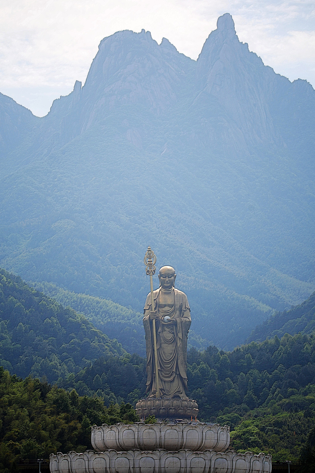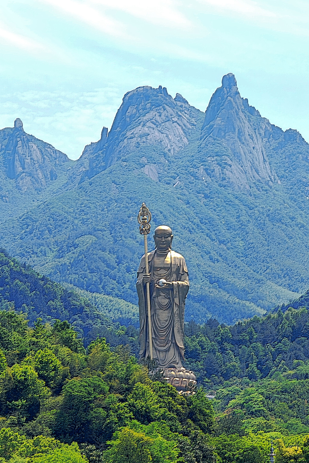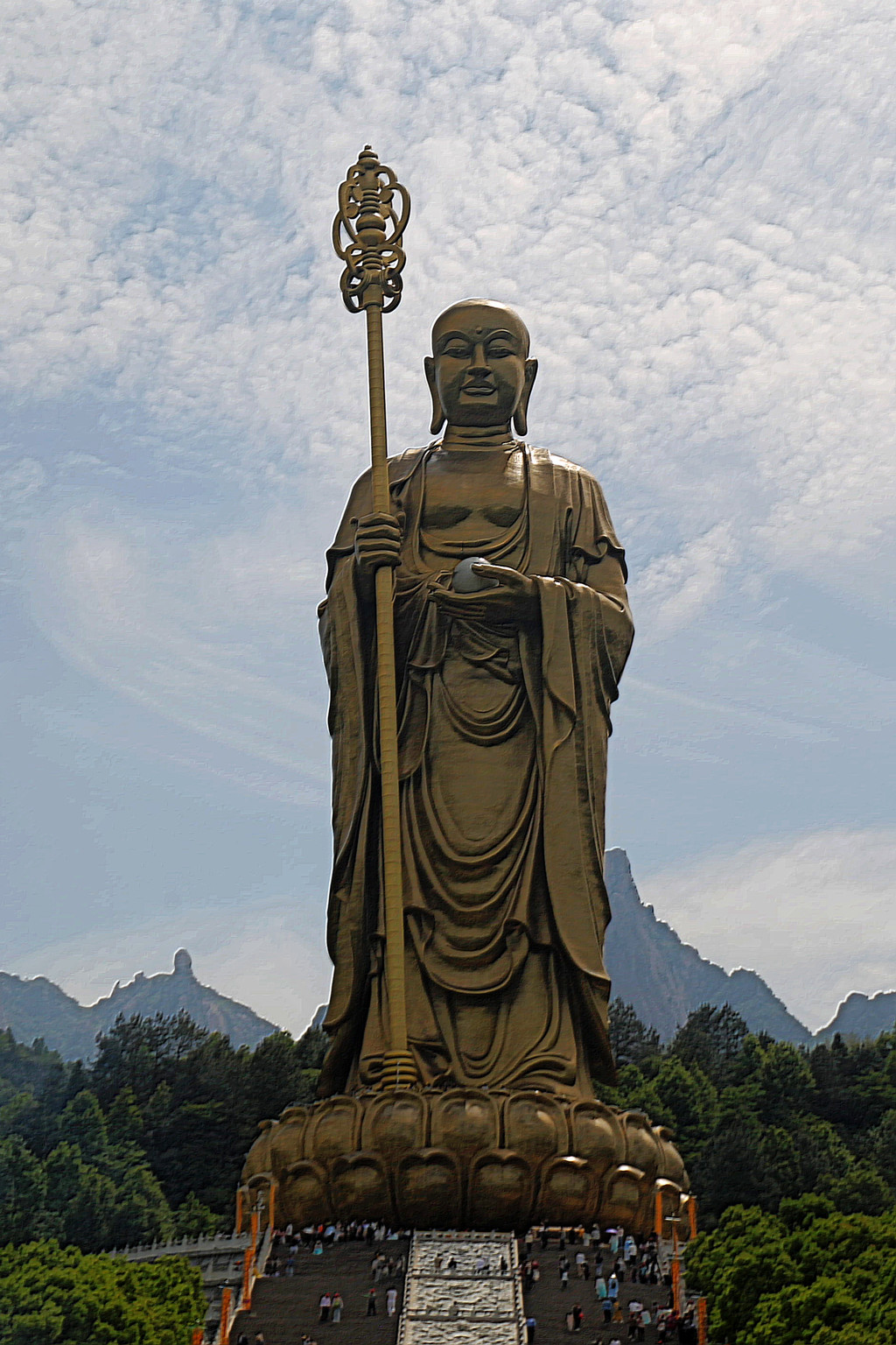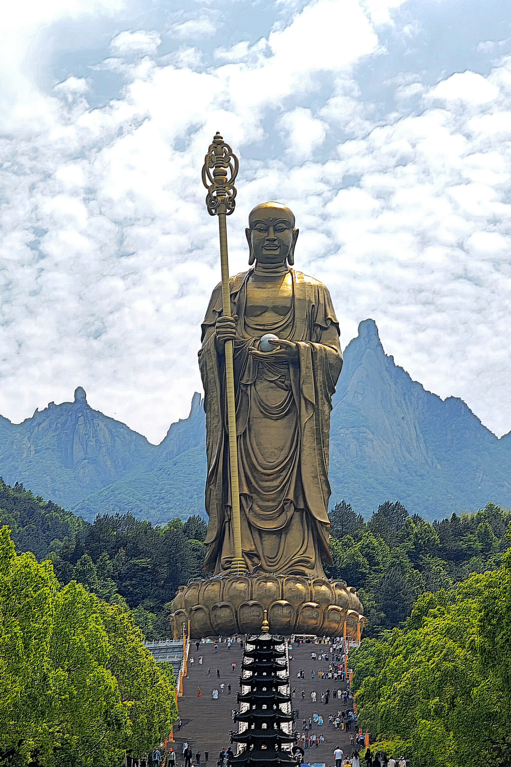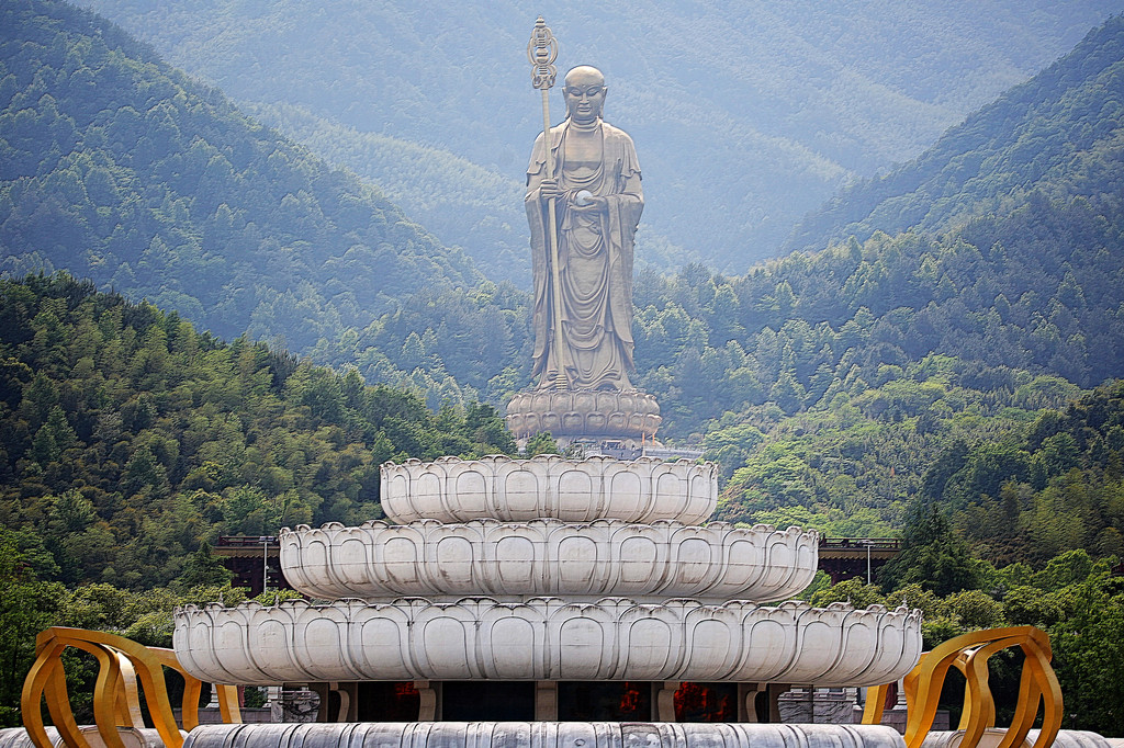 这尊 99 米高的地藏菩萨铜像,主体呈现比丘立相,右手执锡杖,左手托摩尼宝珠,仪态安详,法相庄严,面向西北方向。整座铜像由 3000 块铜铸壁板拼接而成,材质选用仿 18K 耐蚀亚金铜合金,其内部还设有 3 部可直达头顶的电梯。据了解,设计用铜量达 1100 余吨,仅大铜像面部铜壁板浇铸撒金就耗用了 35 公斤黄金。数字 “99”,不仅与九华山的九十九座山峰相呼应,更与金地藏享年九十九岁契合,蕴含着 “九九归一、修成正果” 的深刻寓意。