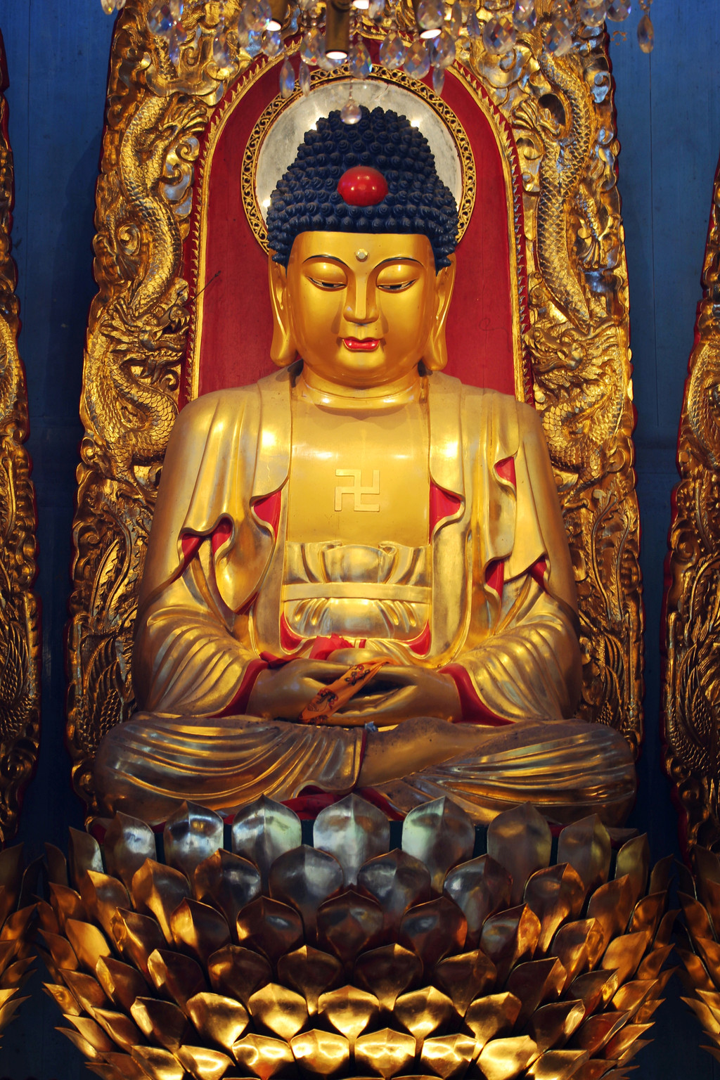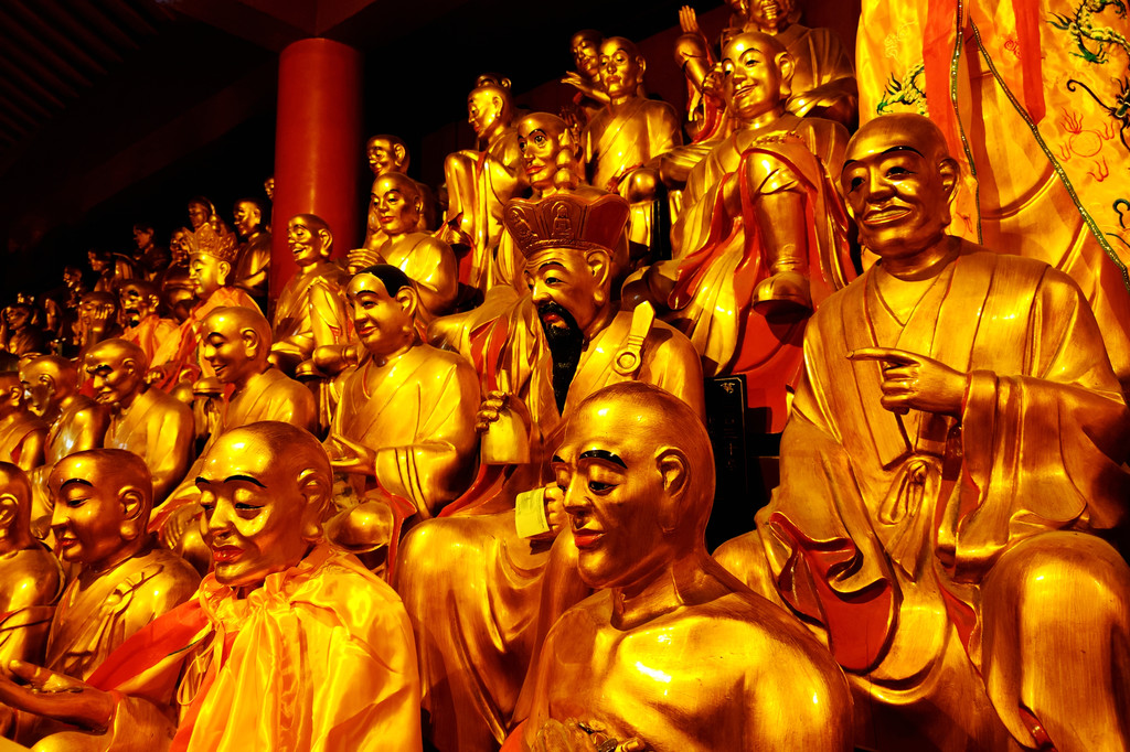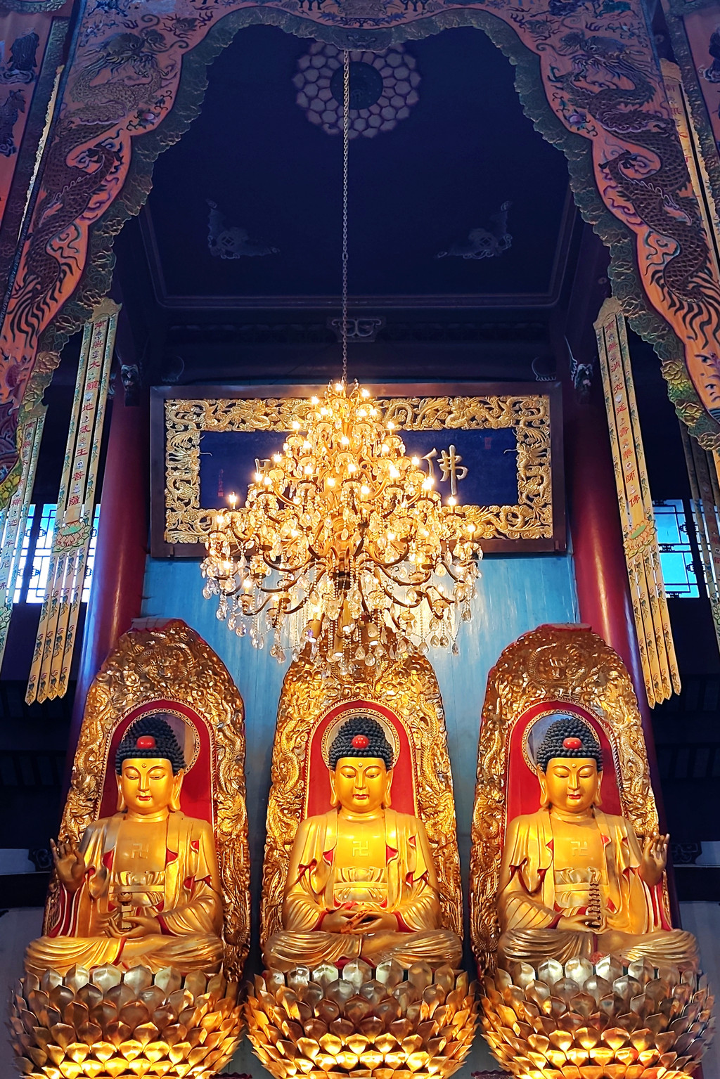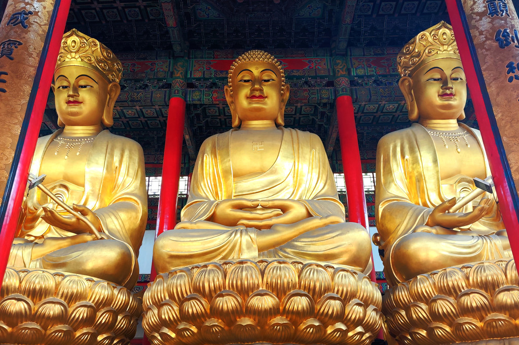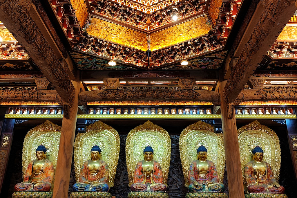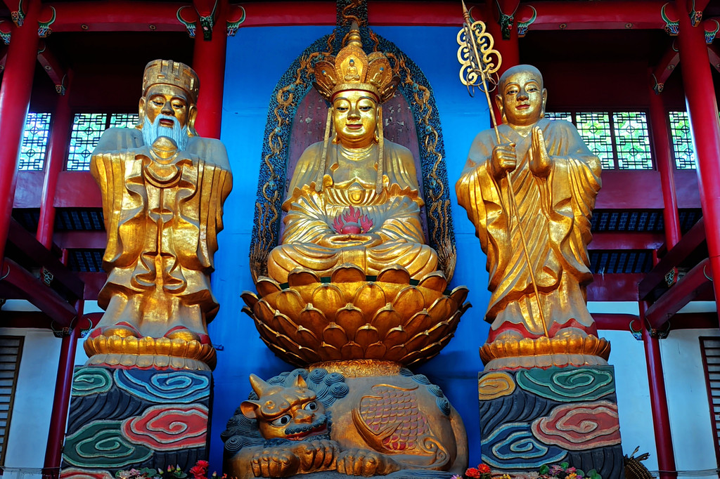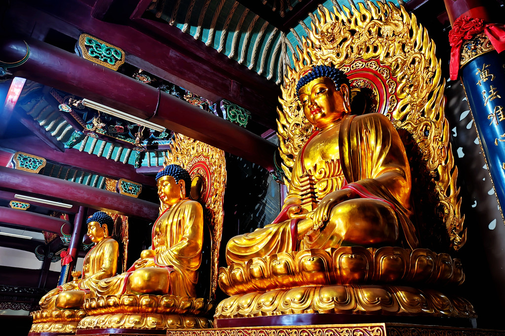接下来的旃檀禅林,是全国重点寺院,始建于清康熙年间,大门面向开山祖寺化城寺,两座山门水平并列分布在寺院两侧。主要建筑为华严宝殿、大悲宝殿、大愿宝殿三大宝殿,呈 “品” 字排列。华严宝殿位于中间,殿内供奉华严三圣,正中为毗卢遮那佛,即释迦牟尼佛的法身,两侧是文殊菩萨和普贤菩萨。大悲宝殿原名大悲楼,是三大宝殿中建成最早的,很多当地人仍习惯称旃檀林为 “大悲楼”。殿内供奉 9.19 米高的四面千手千眼观世音菩萨金身佛像。