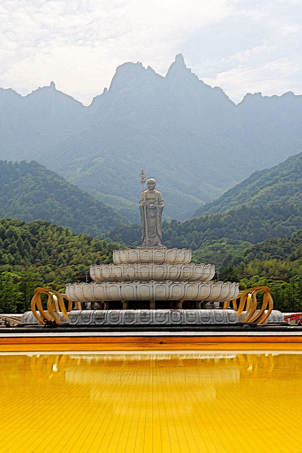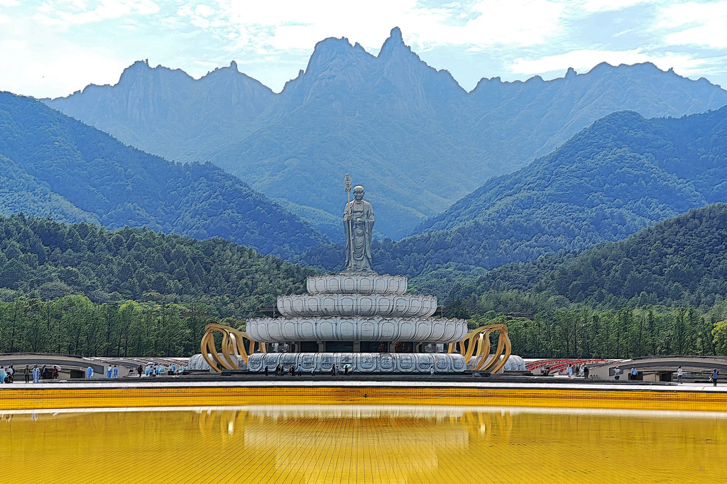 大愿文化园免费对外开放,但其中的弘愿堂需要另外购票参观,我们便未进入,而是绕过弘愿堂,径直来到佛光池。这佛光池直径 99 米,水深仅有 9 厘米,池底全部铺设着金色马赛克。站在池边,地藏菩萨圣像清晰地倒映在水面上,在阳光的映照下,波光闪烁,金光四溢,景象神奇而壮观。