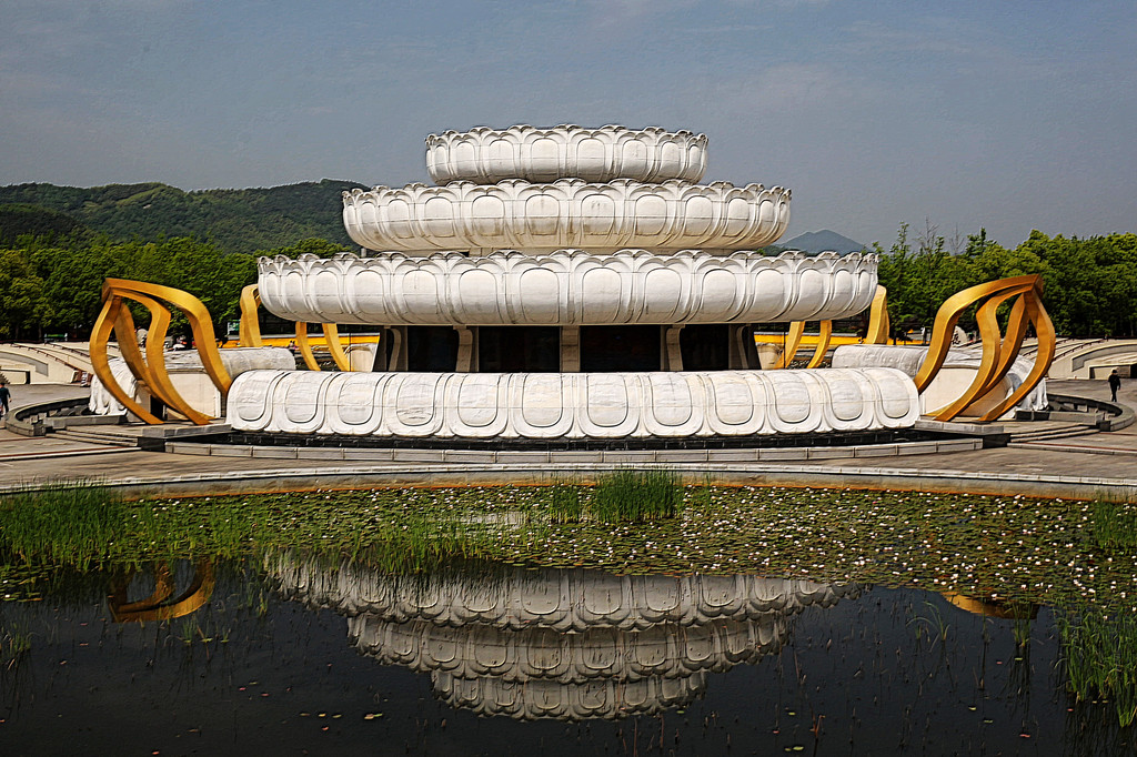 紧接着映入眼帘的是净土莲花,它乃是世界上最大的汉白玉莲花宝座。这座莲花座为三层结构建筑,主体直径达 46.9 米,高度为 12.9 米,由四层共计 136 块莲花瓣组成。