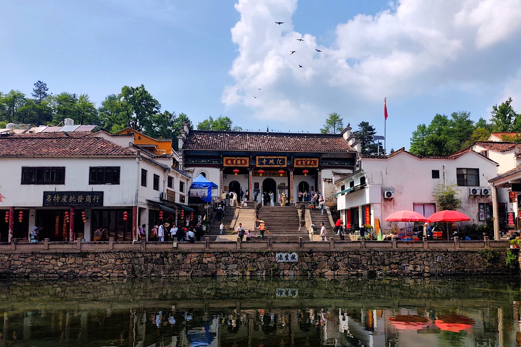 化城寺坐北朝南,整体呈现出严谨的轴线对称布局,从南至北地势逐渐升高。它背靠着白云山,南面朝向芙蓉岭,东侧有雄伟的东崖傲然屹立,西边则有神光岭连绵起伏,北方更有虎形诸峰环绕,仿佛四座山峦共同构筑起一座天然的城池。作为九华山的开山祖庭以及地藏菩萨的道场,化城寺在佛教界拥有着至高无上的地位,无疑是众多信徒前来朝拜与祈福的重要圣地。