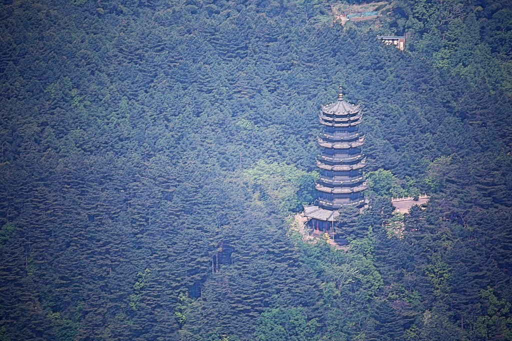 回香阁旁边山坡上,矗立着九华山唯一的单体塔式建筑 —— 万佛塔,又名华严宝塔,由玻璃大王曹德旺捐建。塔为七层,高 33 米,是我国第一座全铜制成的佛塔。
