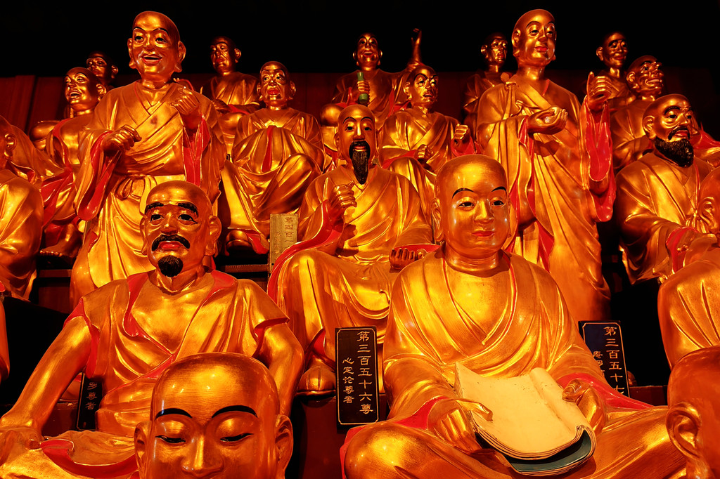 昨天未曾参观地藏禅寺,今日正好顺路游览一番。地藏禅寺的大雄宝殿正中供奉着金地藏菩萨,其身旁分别是闵公和道明。金地藏菩萨结跏趺坐,头戴五佛冠,身披庄重的袈裟,手持摩尼宝珠,神态庄严。左边的协侍是身着袈裟、手持锡杖的道明和尚,右边则是身着俗装、长须白髯的闵公。