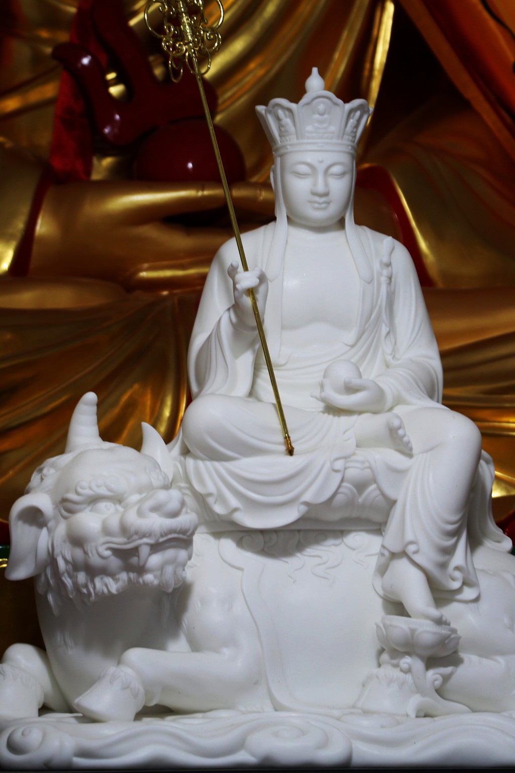 殿门口蹲着地藏菩萨的坐骑 —— 谛听,由金地藏生前养的小狗变化而来。唐代开元末年,金乔觉在九华山潜心修行,随身带着白犬 “谛听”,在共同苦修岁月里,谛听使金乔觉逢凶化吉。金乔觉坐化后,白犬亦傍息。金乔觉被佛门认定为地藏菩萨应化,称金地藏,这只白犬也因是信物、爱物、宠物和护身之物,被佛教尊称为神犬。