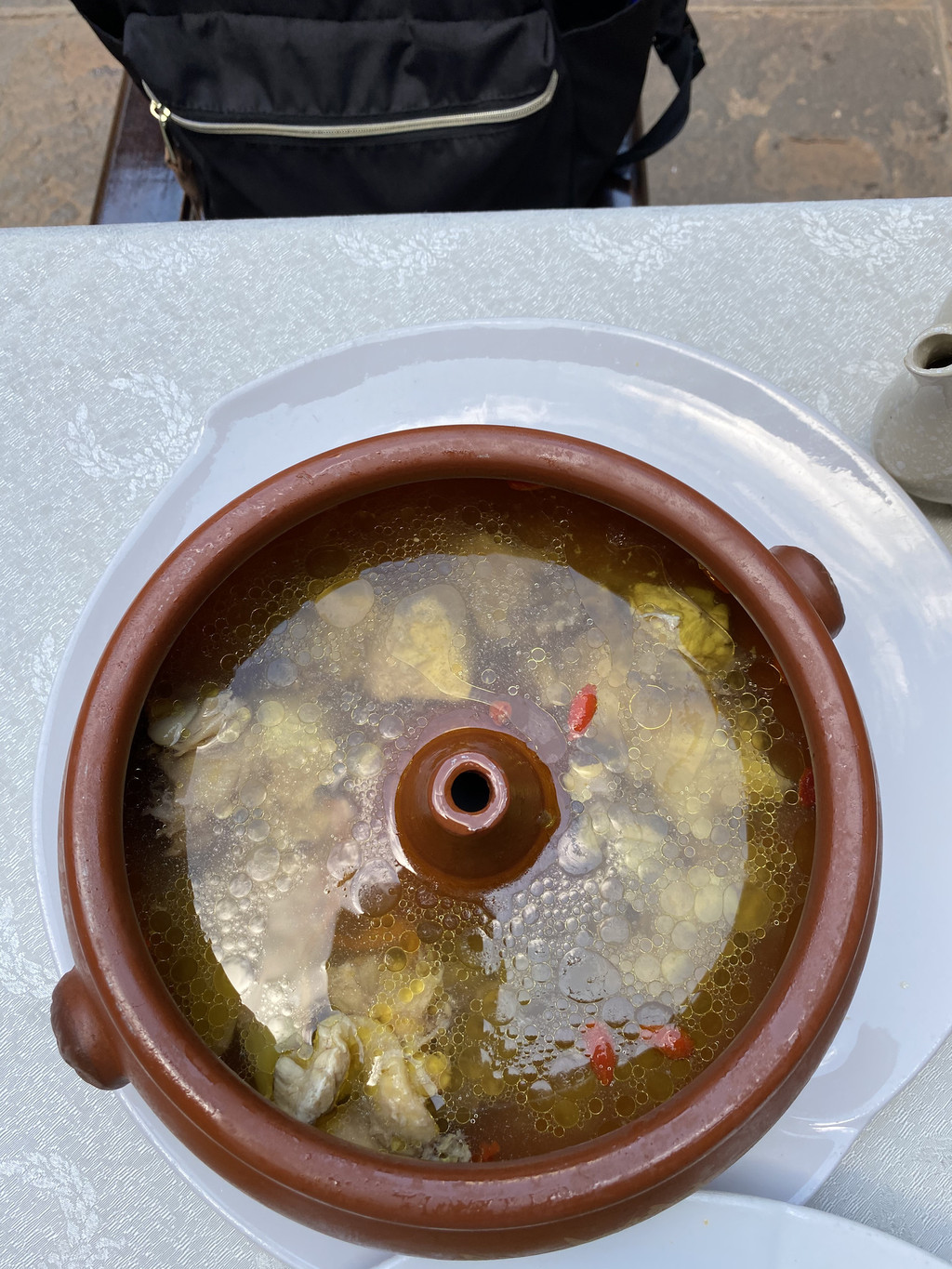 进入6月云南省开始大量食用新鲜野生菌,来昆明旅游不可错过吃菌子,不过吃菌有风险,需慎重。既然是旅游就是为了品尝一下,买了2人套餐。不知道是否因为是端午节,送了4个粽子、2个咸鸭蛋、3盘水果、4晚糖水等小菜,嫩鸡做汤底,18分钟大火煮黄牛肝菌、青头菌、黄罗伞、红乳牛肝菌,浓郁的菌香冲击着鼻腔,打开味蕾,吃个肚胀肠满。