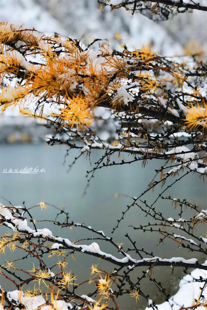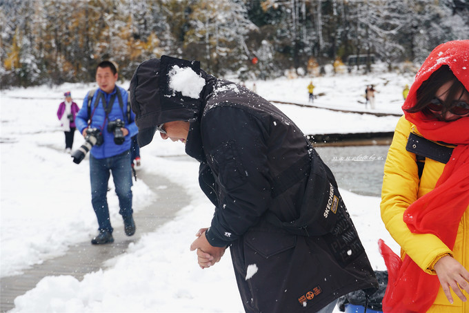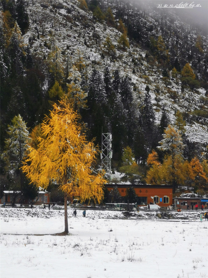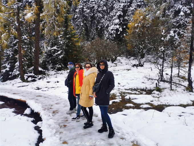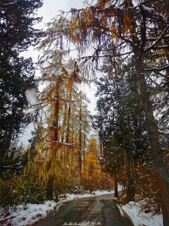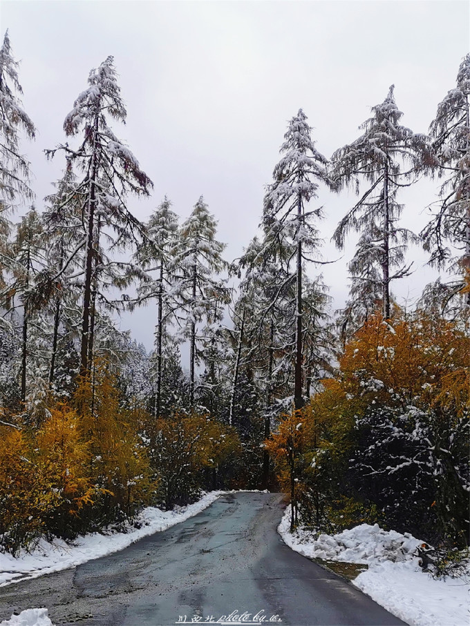 继续坐电瓶车往上,沿途的枫树、槭树、桦树、鹅掌松、落叶松被前一天的白雪覆盖着,今年的雪,似乎来得早了些,秋色还未褪去,冰雪已经到来,生怕错过这里的一草一木。