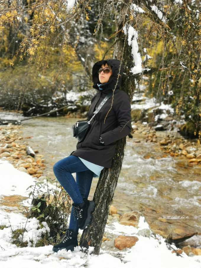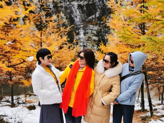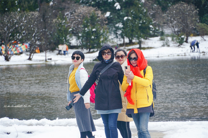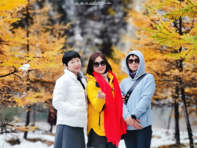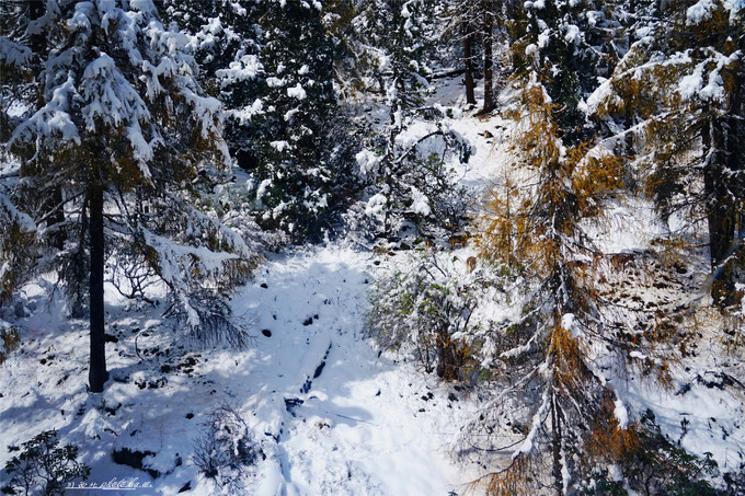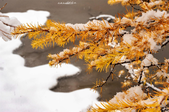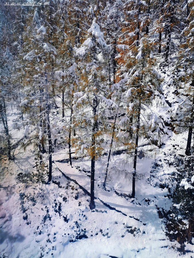 继续坐电瓶车往上,沿途的枫树、槭树、桦树、鹅掌松、落叶松被前一天的白雪覆盖着,今年的雪,似乎来得早了些,秋色还未褪去,冰雪已经到来,生怕错过这里的一草一木。