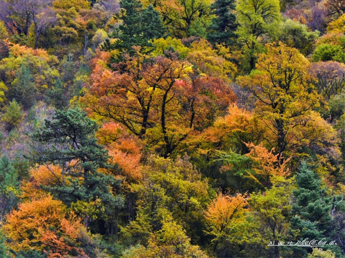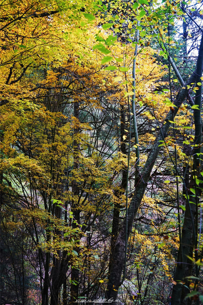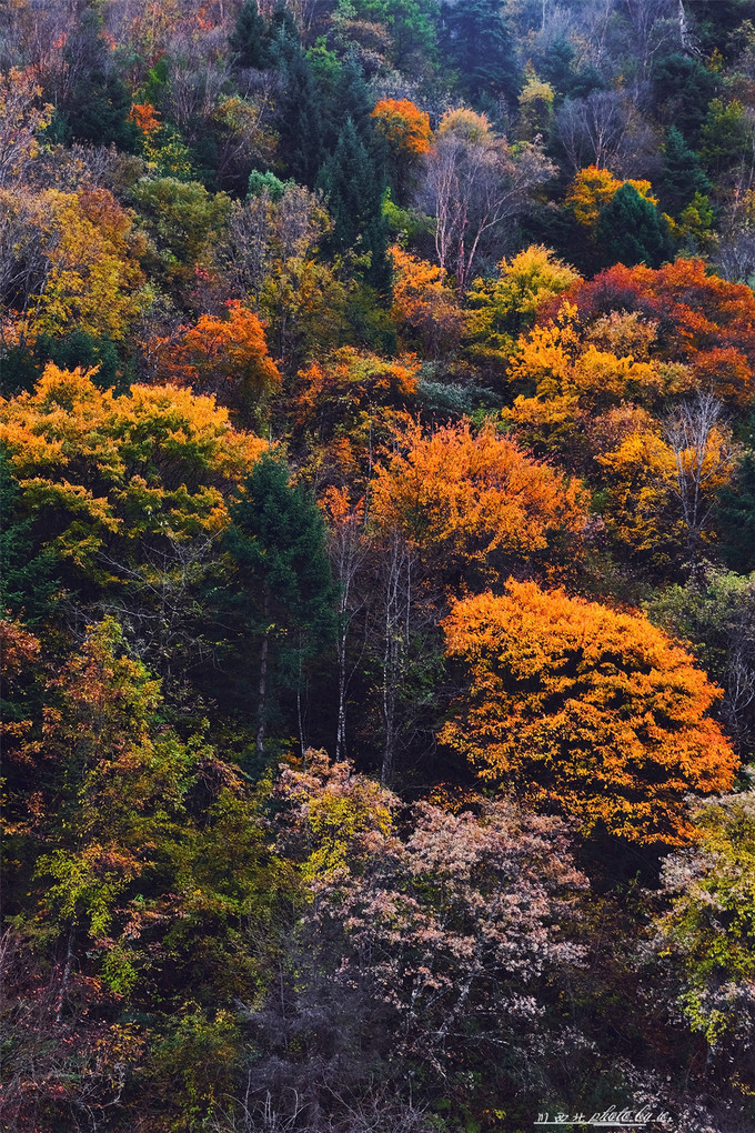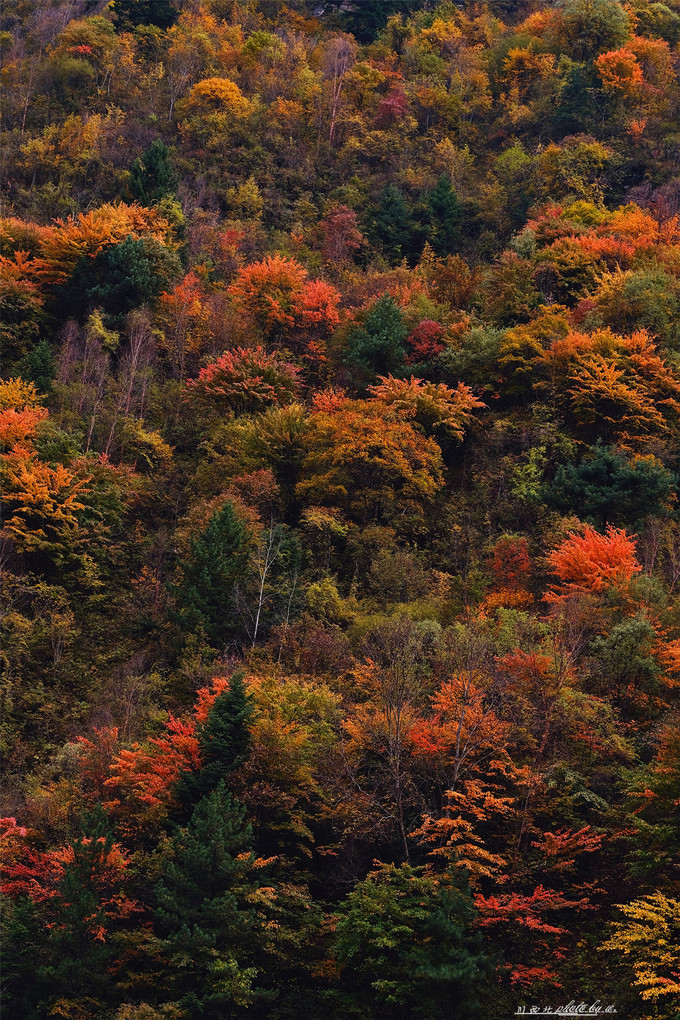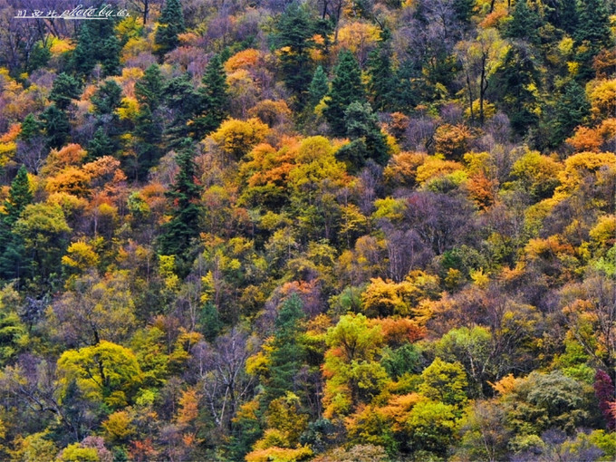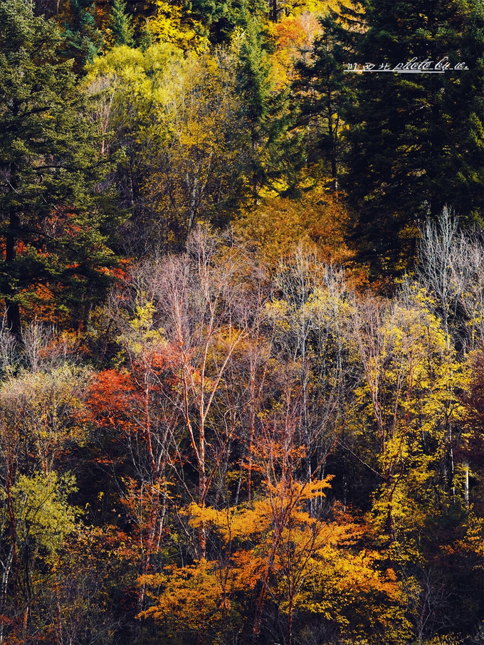 彩林属天然次生林,红灿灿的是枫树,黄亮亮的是桦树及栎树,绿葱葱的是冷杉。红、黄的基调,又慢慢燃烧出粉红、桔红、朱红、紫红、淡黄、米黄、金黄、橙黄……,这应该是秋天给即将到来的冬天谱写的一首深情恋歌吧!